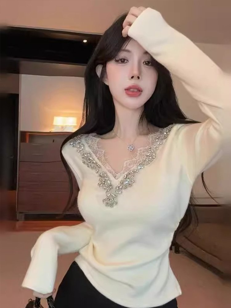 纯欲风蕾丝镶钻v领t恤女冬季高级感内搭