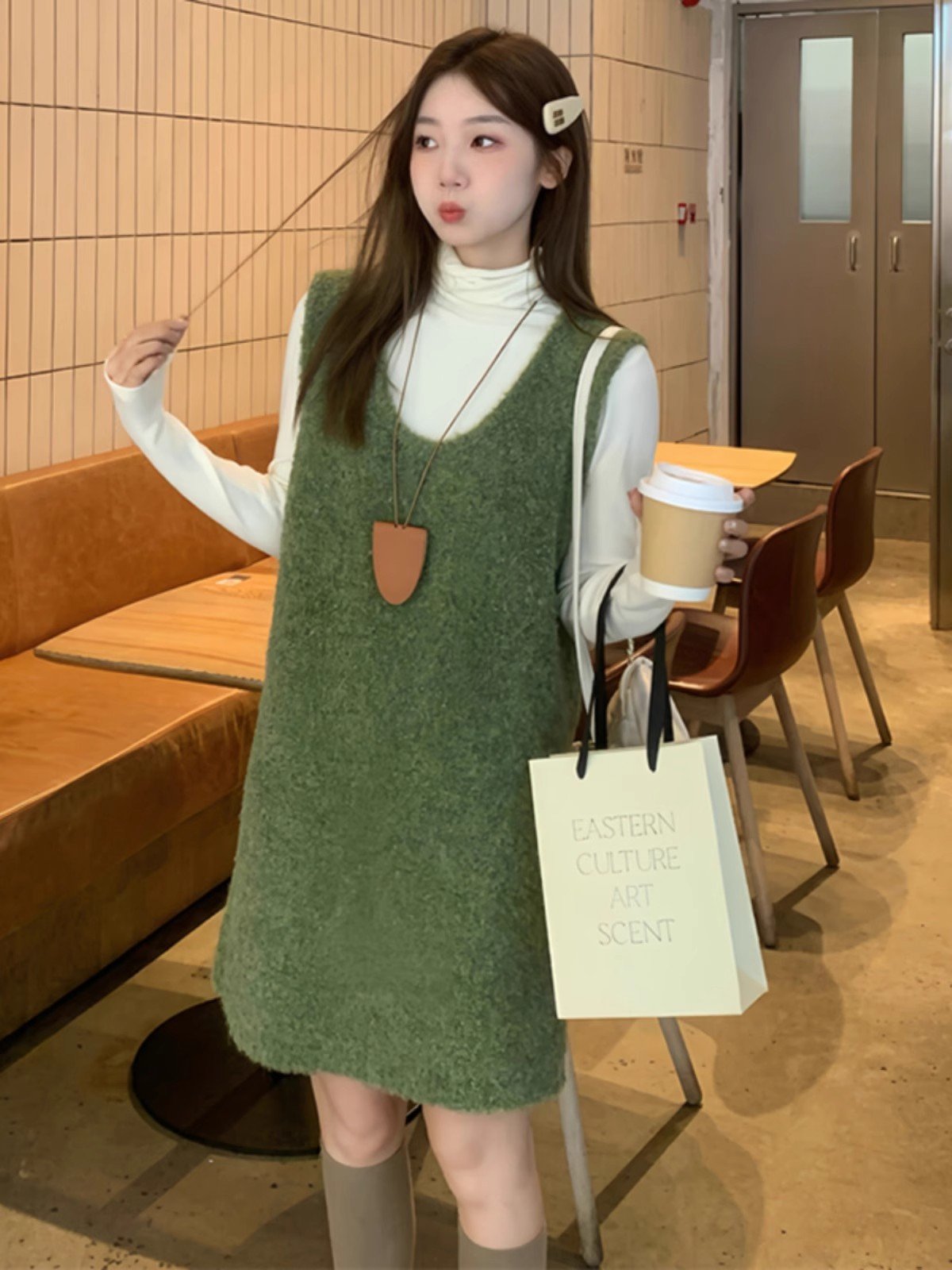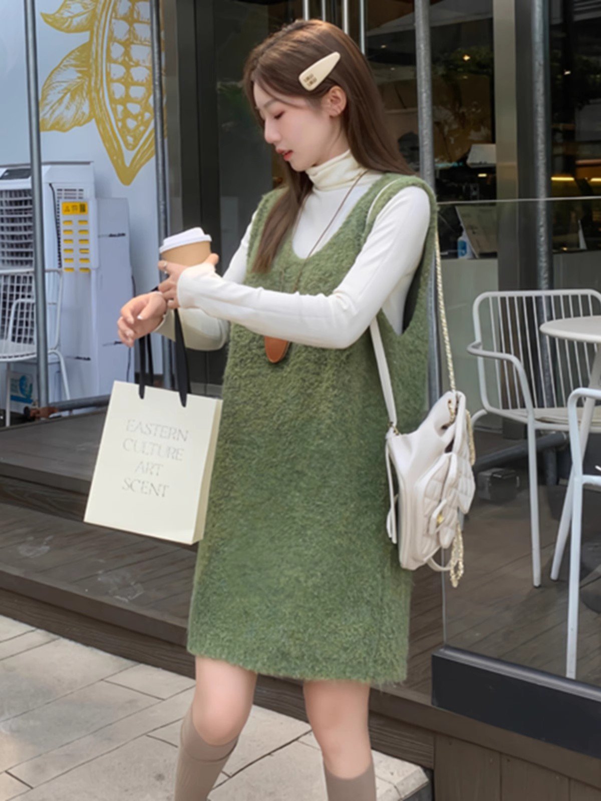 绿色针织背心吊带连衣裙女冬季miu系千金