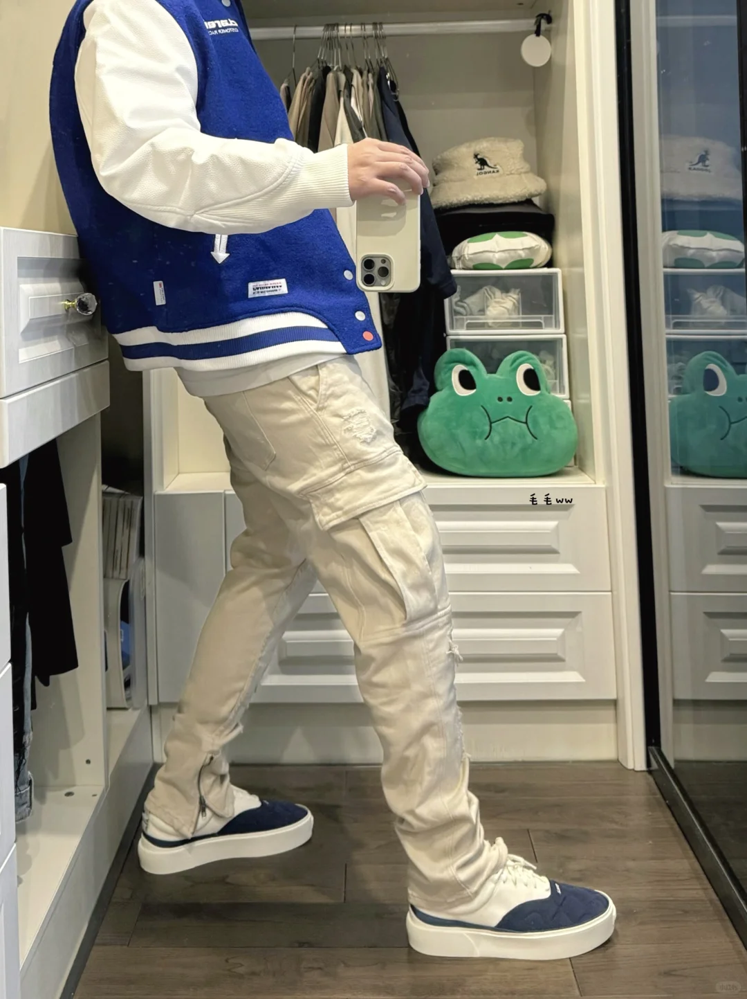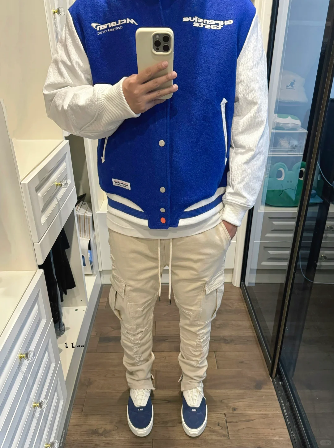 -少年感的蓝色系穿搭,高饱和度克莱因蓝真的讨喜,穿上就有活力的感觉 . -皮袖拼接的棒球夹克,窄版的拉链工装裤,再选一双能配色呼应的硫化鞋 . —————— . ✏️本人178cm75kg 球鞋尺码265mm(正常EU42) . 💭以上均为我个人观点,不喜勿喷,欢迎讨论。