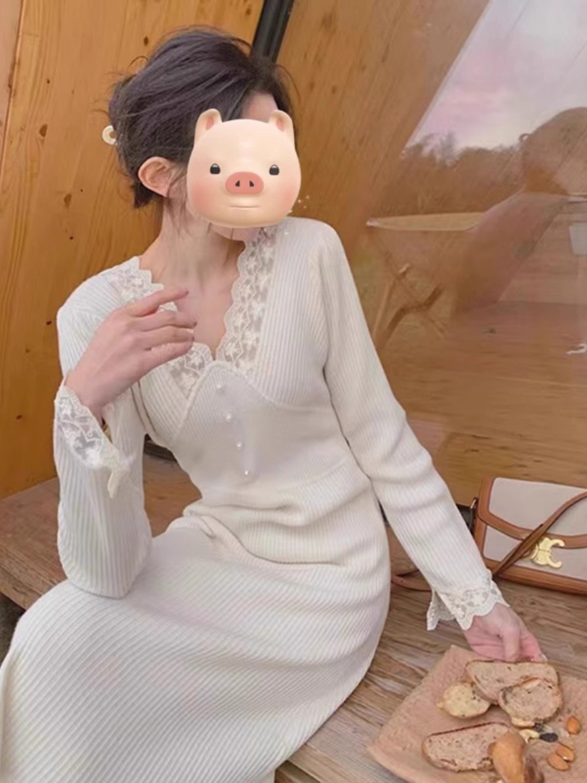白色蕾丝v领针织连衣裙女冬季miu系穿搭