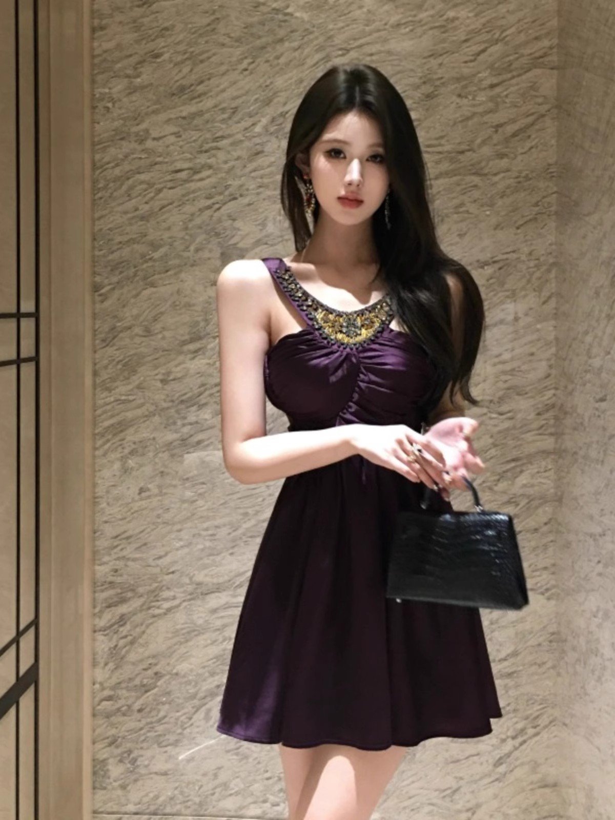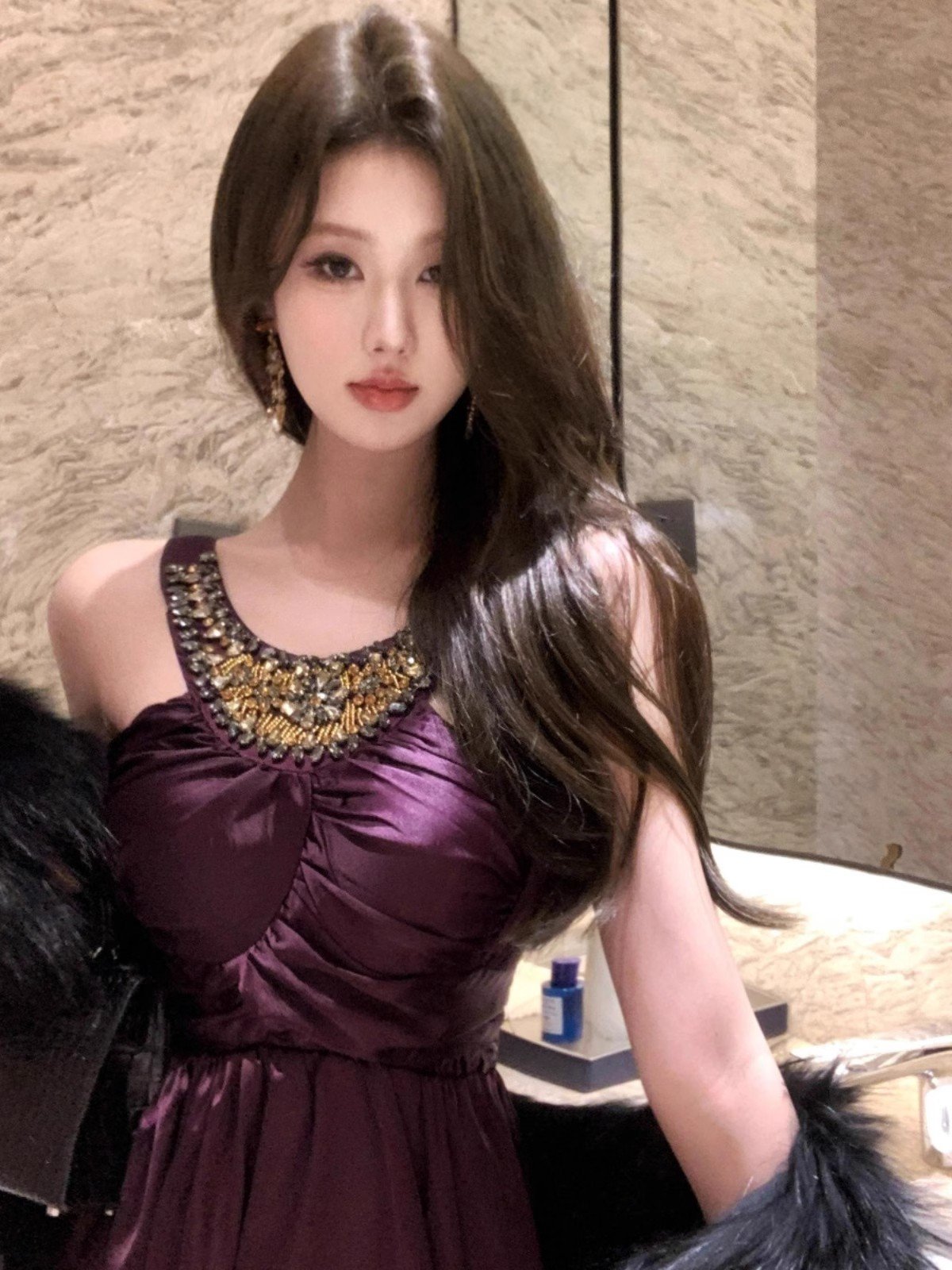 法式紫色重工镶钻吊带挂脖连衣裙女冬季高级