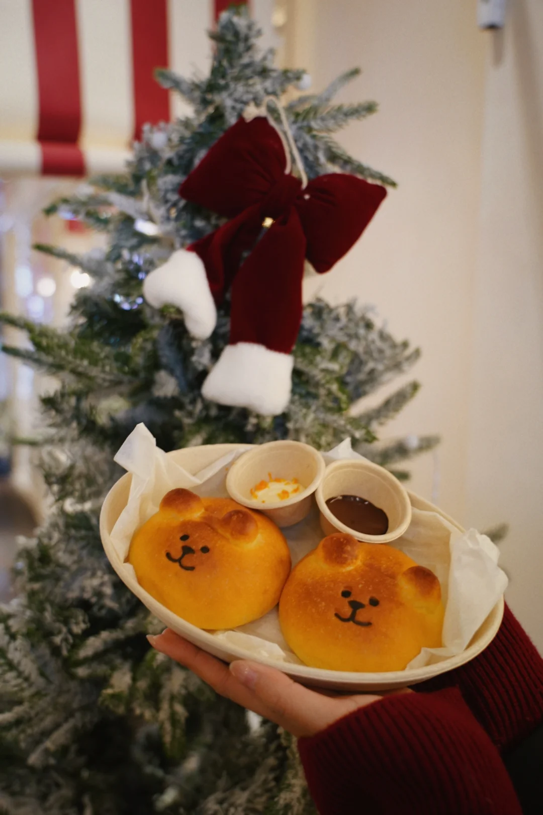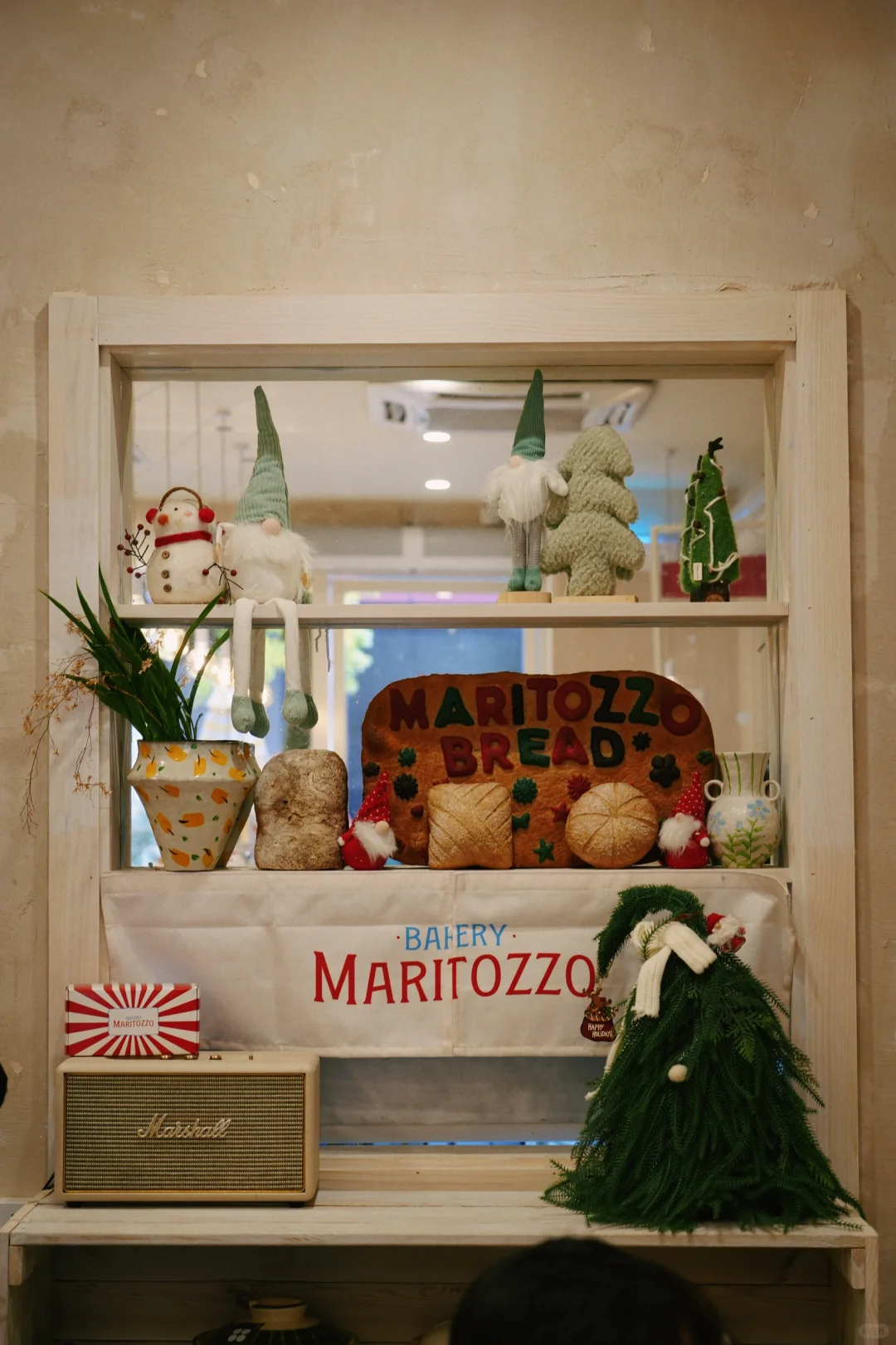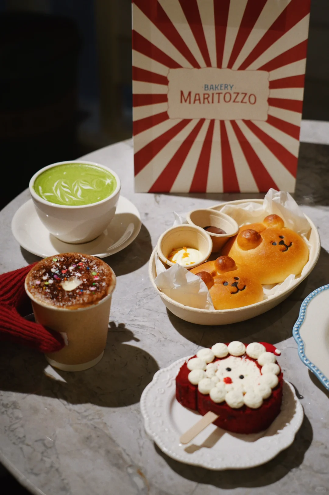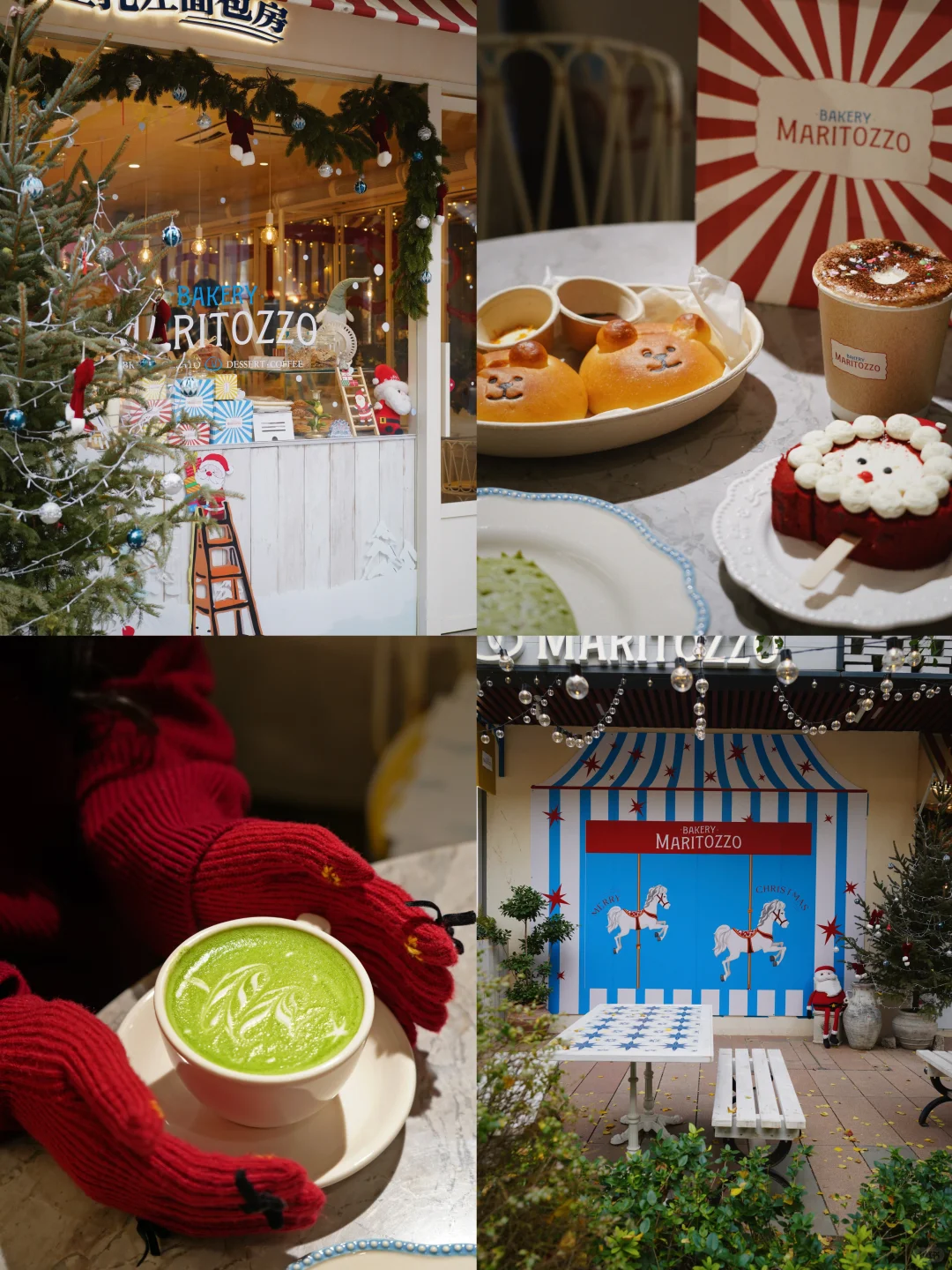 马里托左确实好拍,本身的装修风格就是纯白色系碰撞彩色色块,加上了各类的圣诞元素,感觉下了雪会更好看。上了圣诞的限定品,圣诞树抹茶拿铁、甜甜圈可可,暖呼呼的很适合冬天。小熊面包配的橙子乳酪很清爽;圣诞树的内馅儿是莓果酱乳酪,够酸我还挺喜欢的;瑞士卷是圣诞老人造型,很应景。