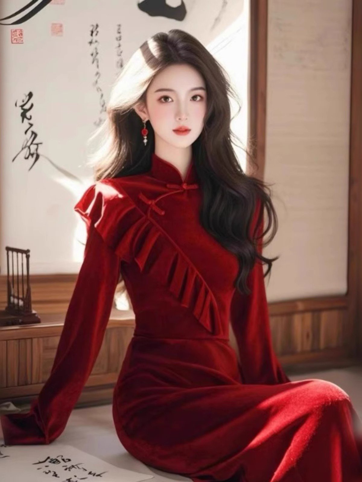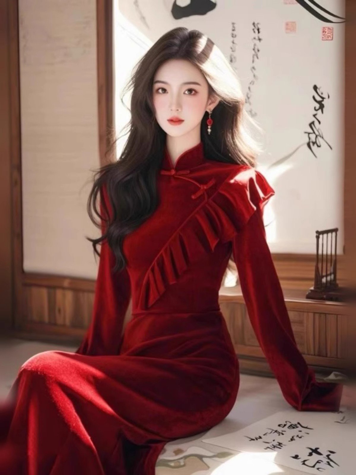 新中式红色丝绒改良旗袍连衣裙女冬季新年战