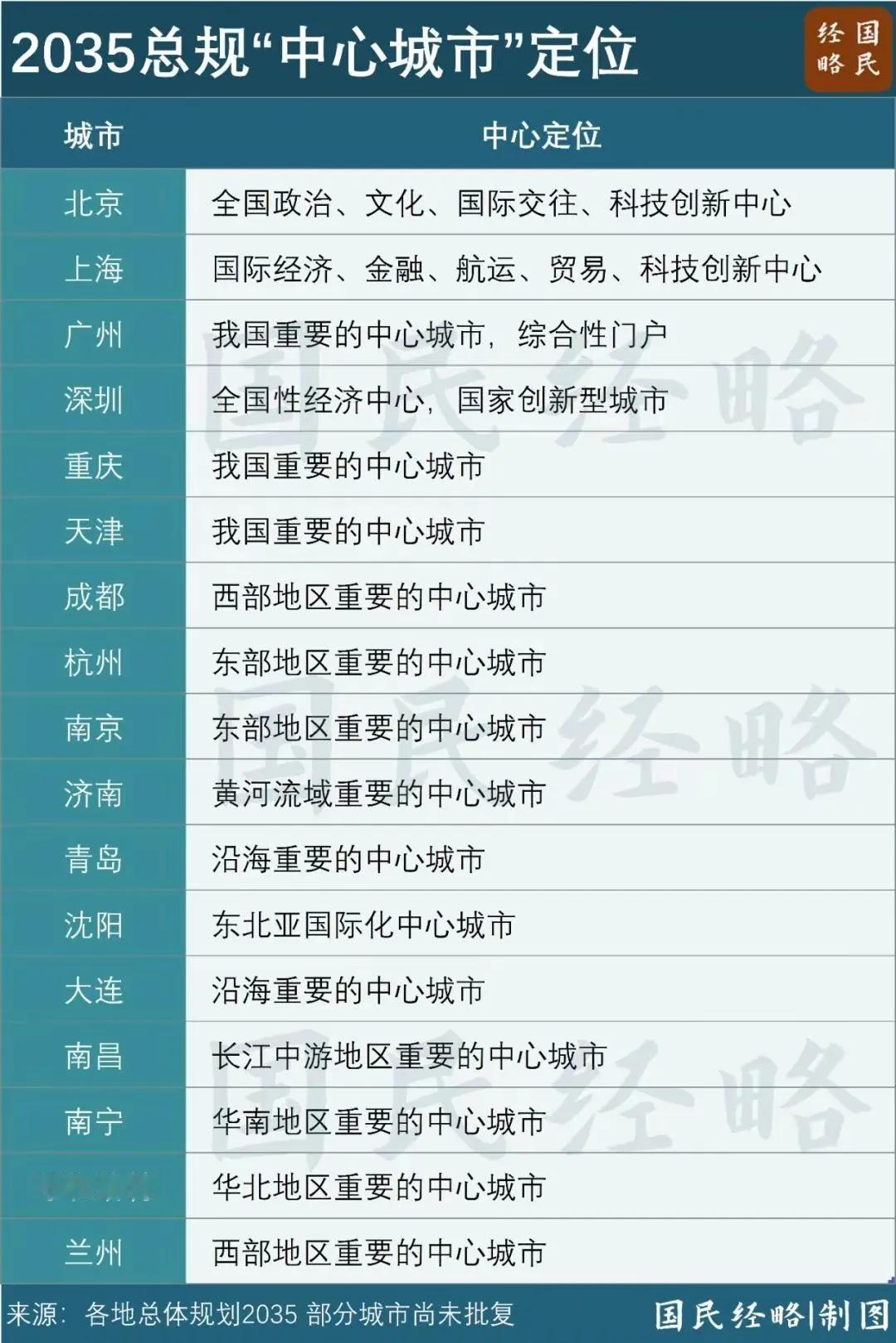 部分城市2035年定位,北上广津渝是国家中心城市,成都、杭州、南京都是区域性中心城市,呼声很高的武汉、郑州、西安还没有公布,但大概率也是区域性中心城市。