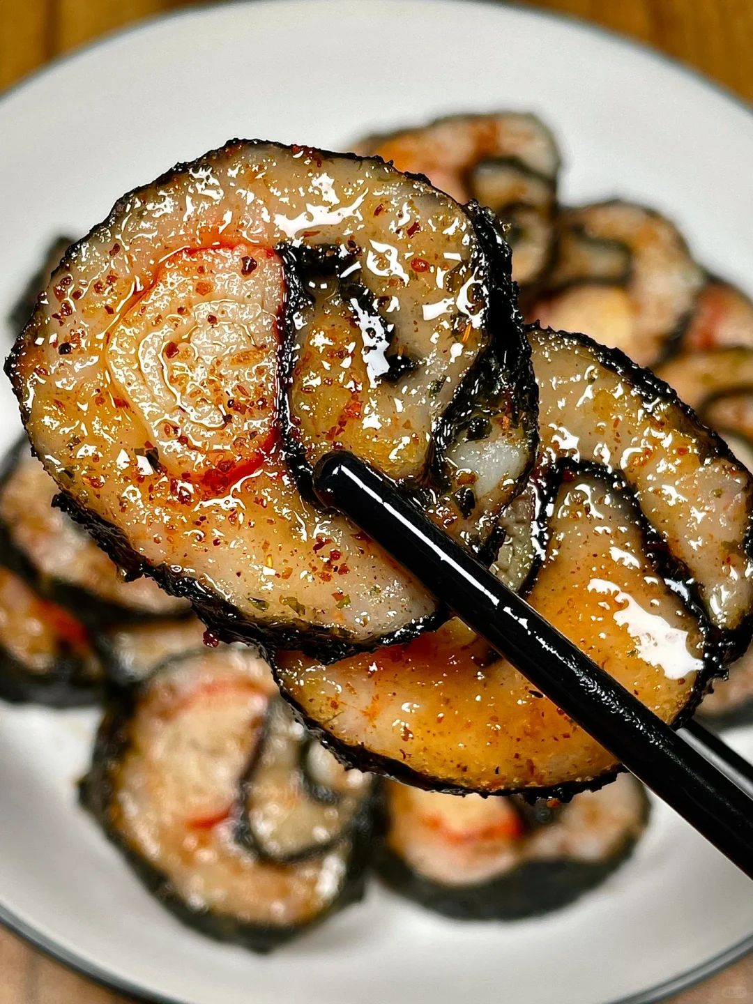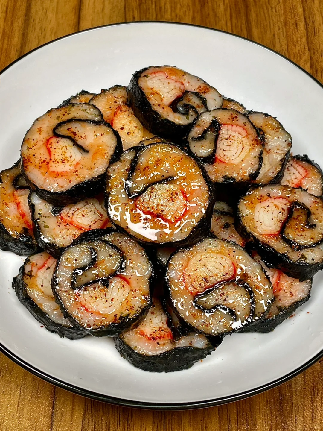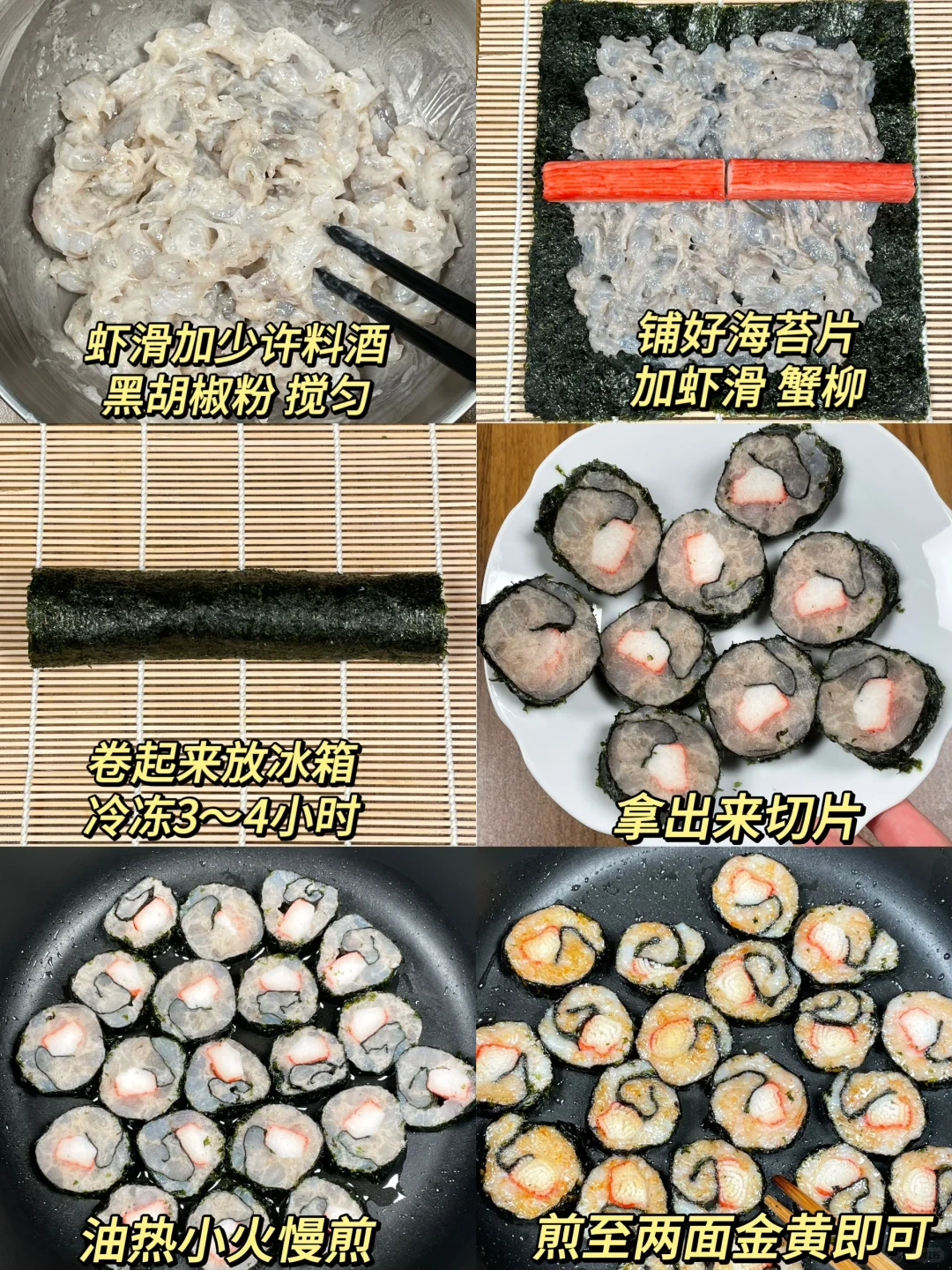 超好吃的蟹柳虾滑海苔卷!一定要试试!! 虾滑Q弹鲜美,外焦里嫩,裹上蟹柳,一口惊艳!太好吃了吧[哭惹R][哭惹R]做法简单不翻车,求你们都去做!! [向右R]食材:虾滑➕蟹柳➕海苔片 [向右R]做法:如图所示!