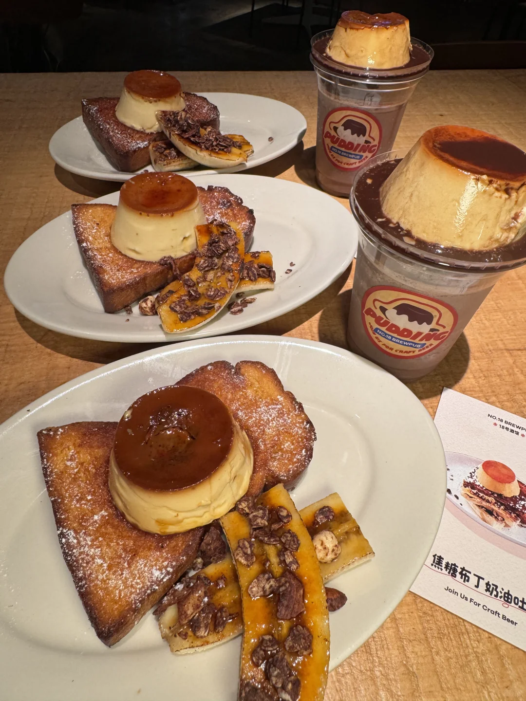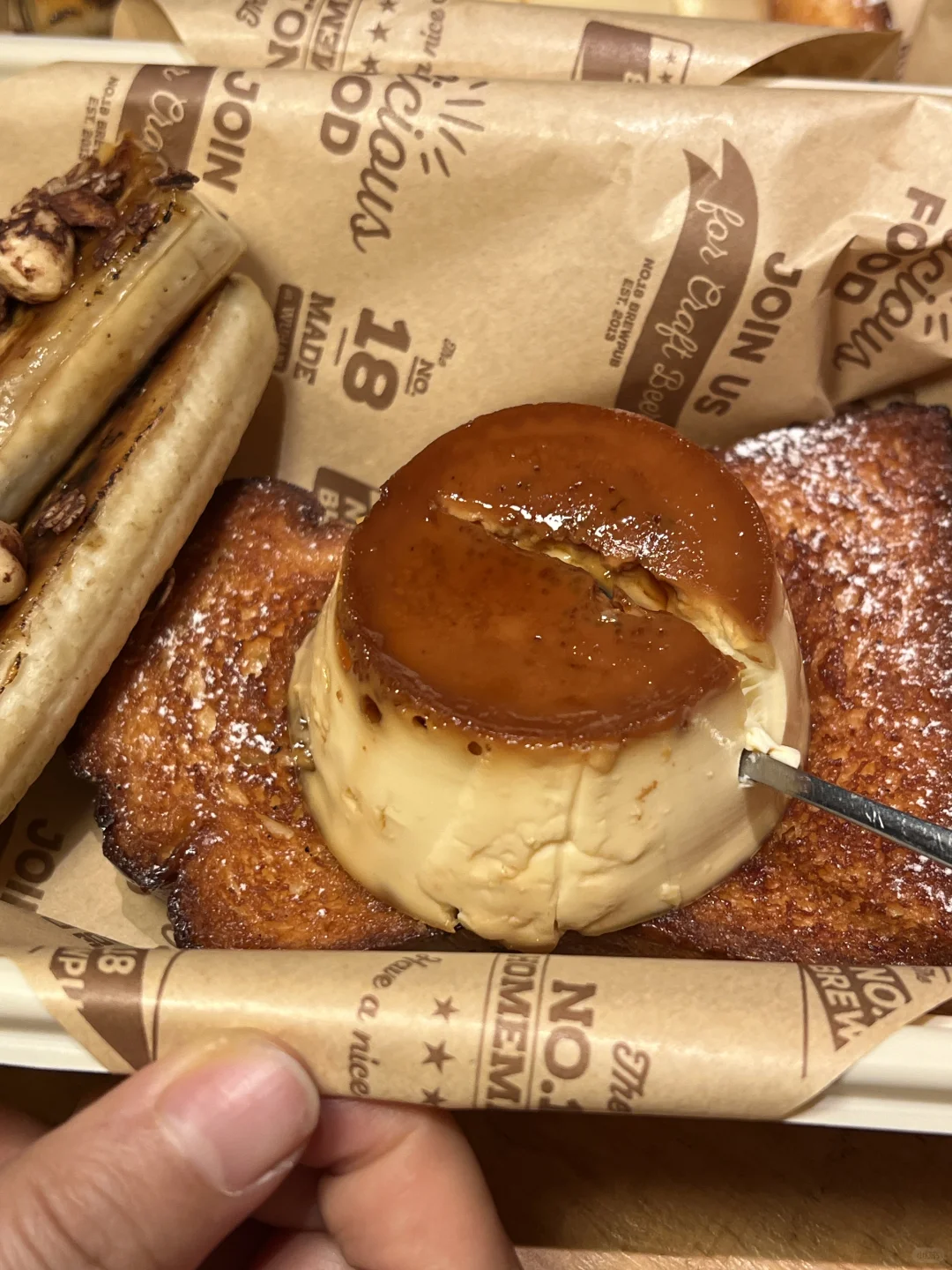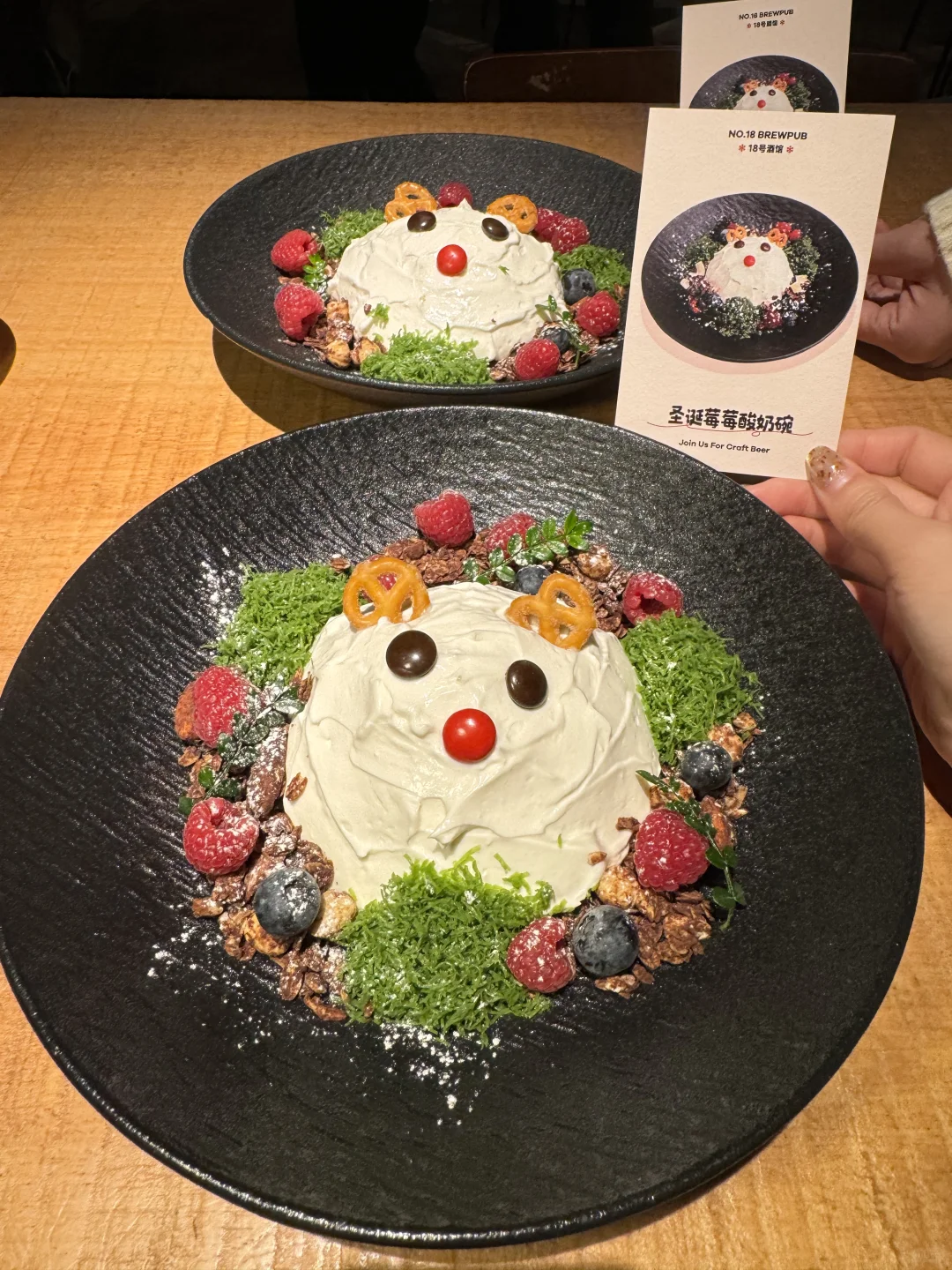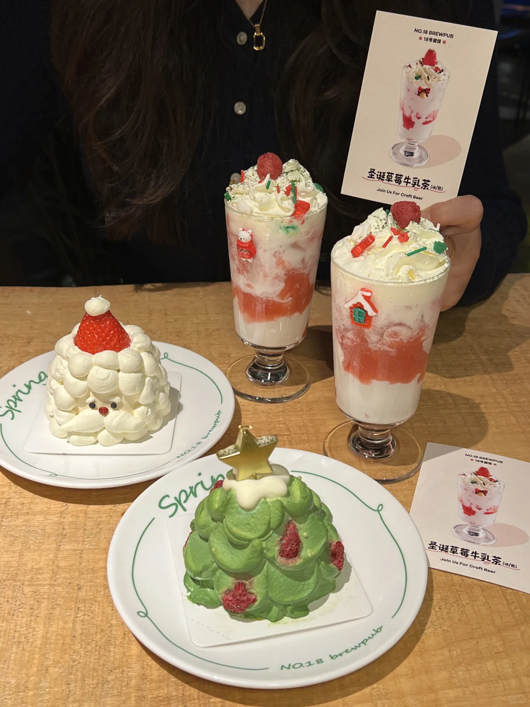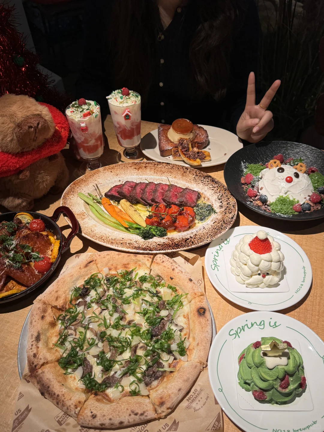 终于吃到了焦糖布丁奶油吐司!!!布丁特别嫩,焦糖味很浓郁,吐司也是脆脆的。 还有圣诞草莓酸奶碗、巧克力可可布丁、圣诞草莓牛乳茶…店里都是圣诞装置,还会“下雪”超有氛围。