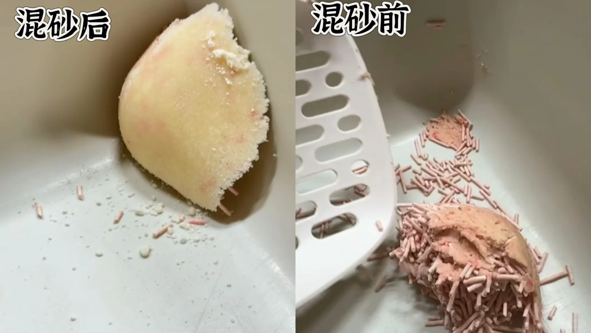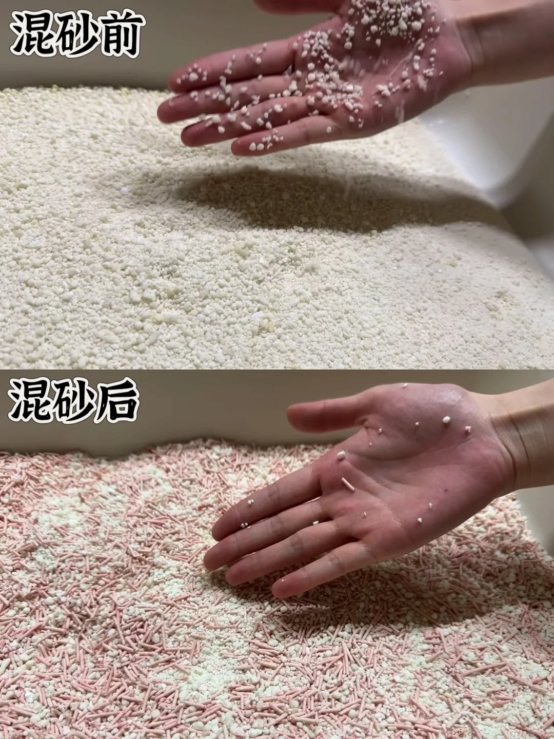 我买了🌟喵彩木薯砂🌟混随便买的豆腐砂,大致的比例是1(木薯砂):2(豆腐砂)效果真的嘎嘎的!他们家的砂我算是回购的最多的了,木薯砂原本的结团能力就很好,就是吸水会慢一点点!混了豆腐砂以后吸水又快又牢!都不带黏底的了~ 而且豆腐砂的大颗粒刚好能把细碎的小木薯砂压在下面,完全不用担心猫砂会跟着猫跑遍全家~