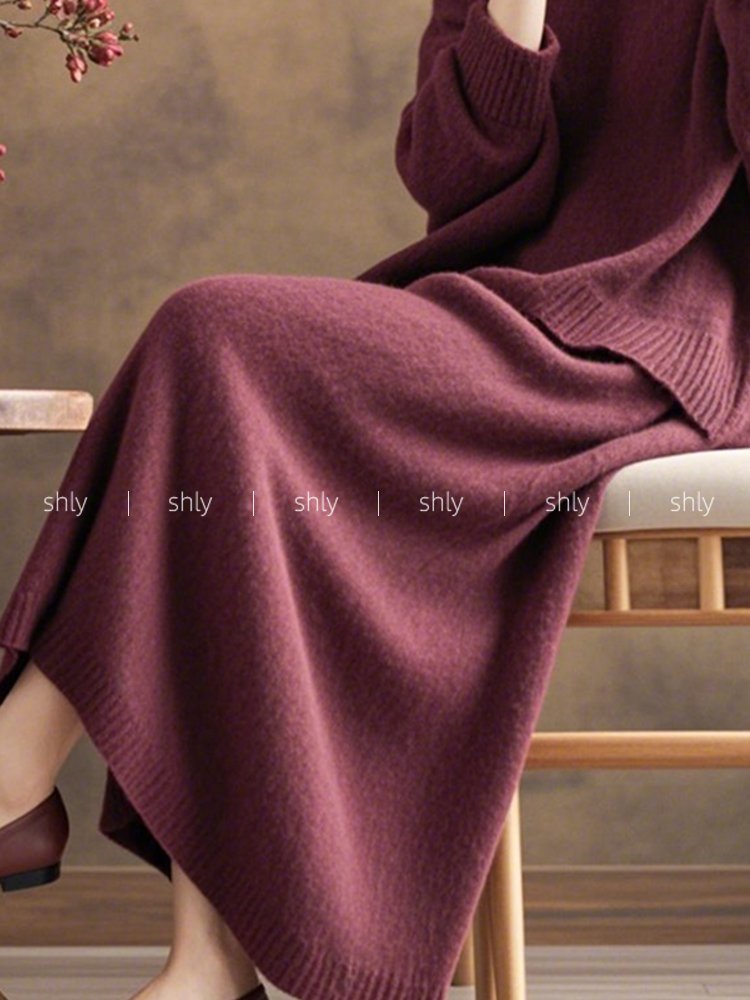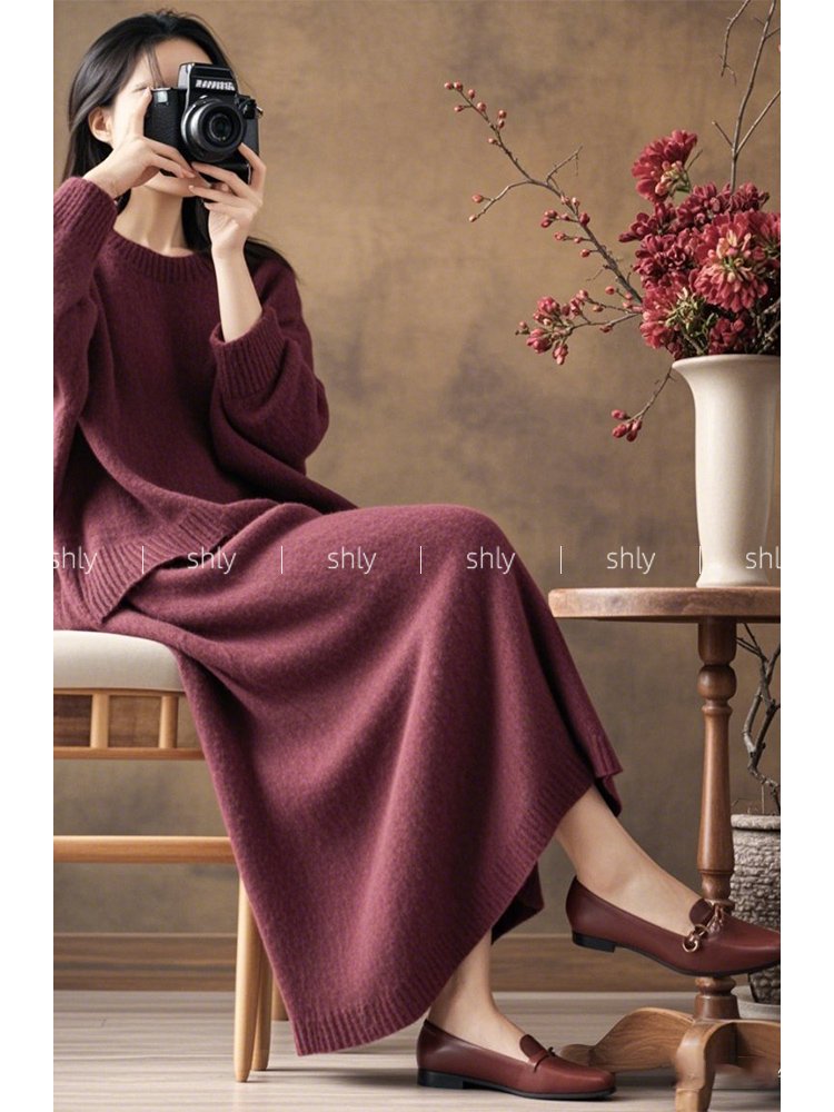 冬季小香风大衣内搭紫红色针织毛衣连衣裙子套装2024新款女秋冬款