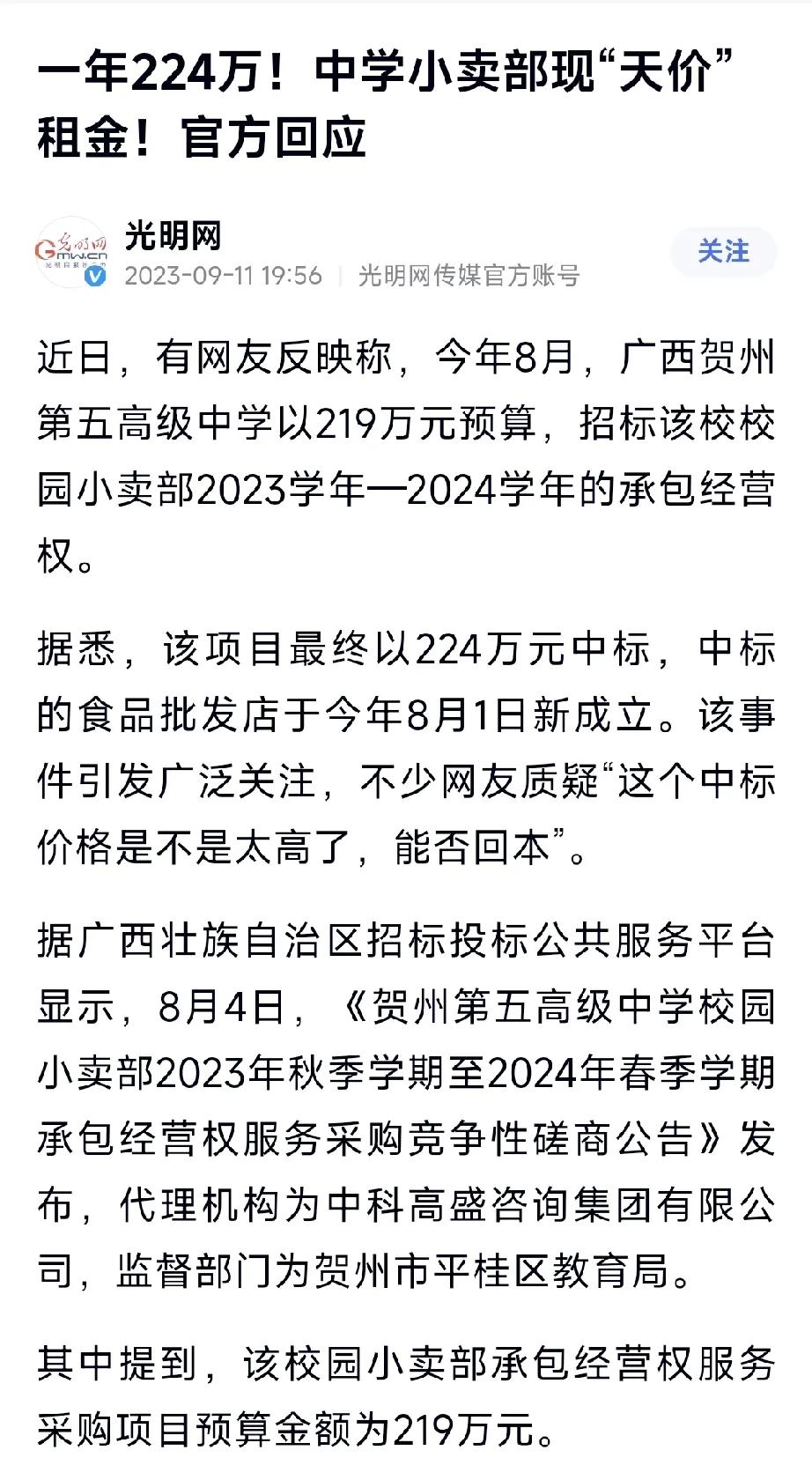 我们误会济大超市了,一碗煮泡面卖10元真不贵! 网传济大超市承包价高达800万,不知道是几年,但一年至少也得上百万吧,那么小的地方,承包价这么高,超市要回本,商品怎么可能便宜? 这也解释了为什么超市老板能挤走食堂档口老板,人家是学校的大金主,你一个食堂档口一年能给学校多少钱?比得了吗?学校向着谁还用说吗? 归根结底,学校超市承包价太高,羊毛出在羊身上,最终还是学生买单。类似问题不止济大存在,而是普遍现象,学校是相对封闭的场所,超市、便利店都有大量稳定的顾客,生意差不了。学校就利用这一点搞竞标,承包价往往被抬到天价。 去年光明日报报道,一个中学小卖部一年承包价224万;还有广西玉林,两所学校小卖部,一个 200 平,拍出每年 380 万,一个 150 平,每年 340 万。太多太多了。