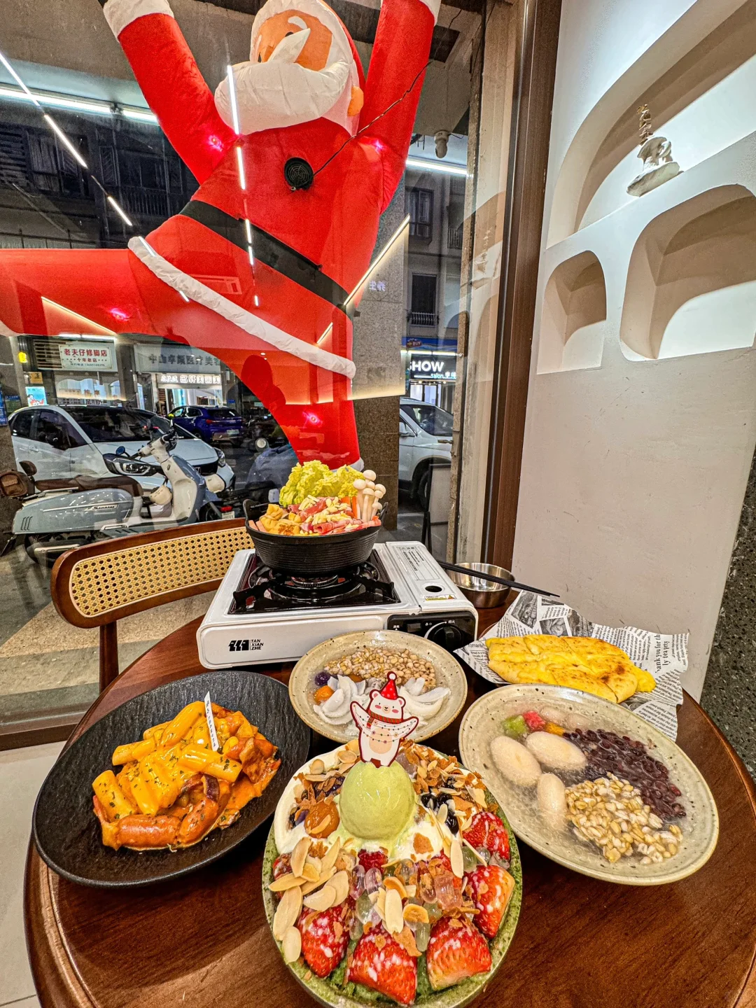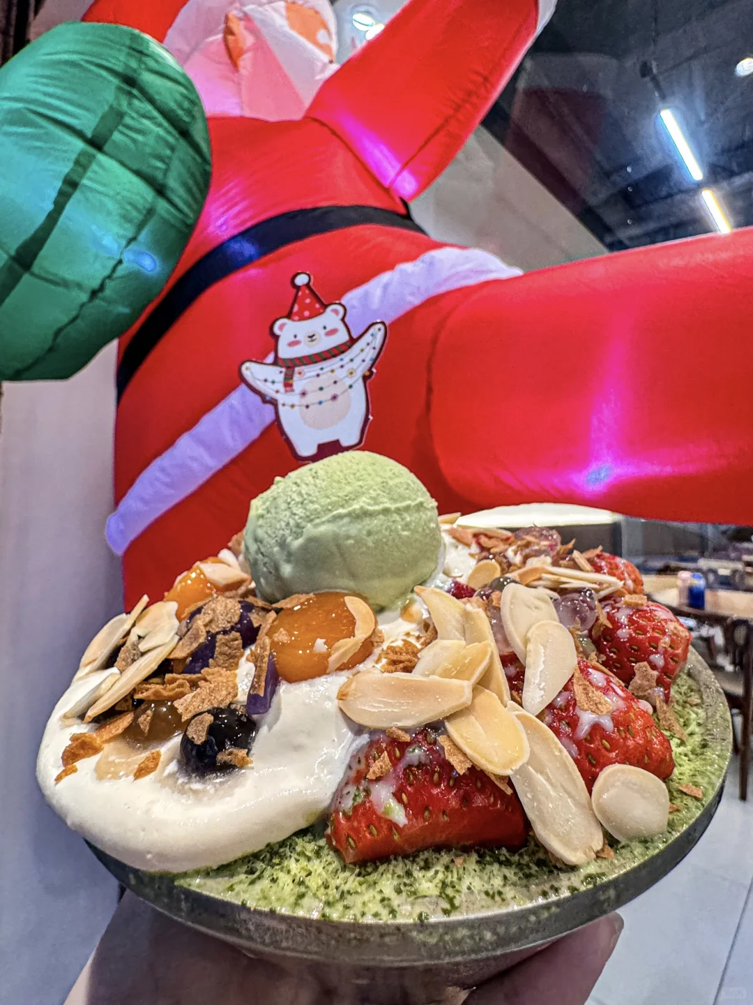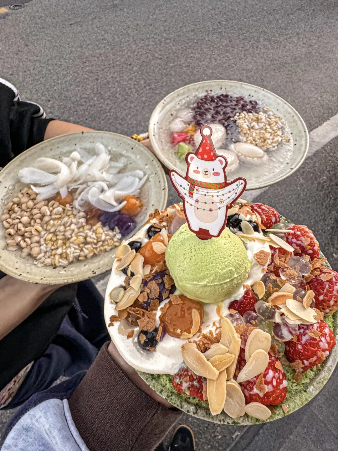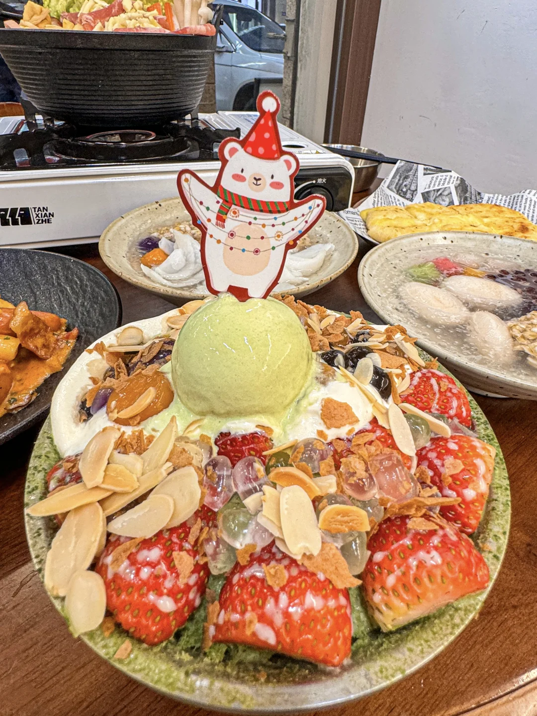 知道他家的牛奶冰是人气担当 没想到原来潮汕甜汤也好圈粉!本潮汕人爱了😍 一整碗东京丸加上糯叽叽的鸭母捻和芋圆 贼拉浓稠! 吃起来就是清爽不甜腻 很健康的口感! 牛奶冰也出了圣诞版的🍓🎄 依旧是我最爱的抹茶沙冰!! 一半酸甜大颗的草莓 一半浓郁的芋圆珍珠奶盖! 上面还挖了一大颗抹茶冰淇淋🍵 jeng到啊…每口都贼满足!一下炫掉一大半! 新出的🥘部队火锅 这天气就馋这一口暖呼呼的 还有爆浆榴莲饼!皮薄脆馅巨多!榴莲脑袋冲🤩 他家自从扩店后真的多了不少融合菜 就是说圣诞大餐可以速速安排起来啦!!