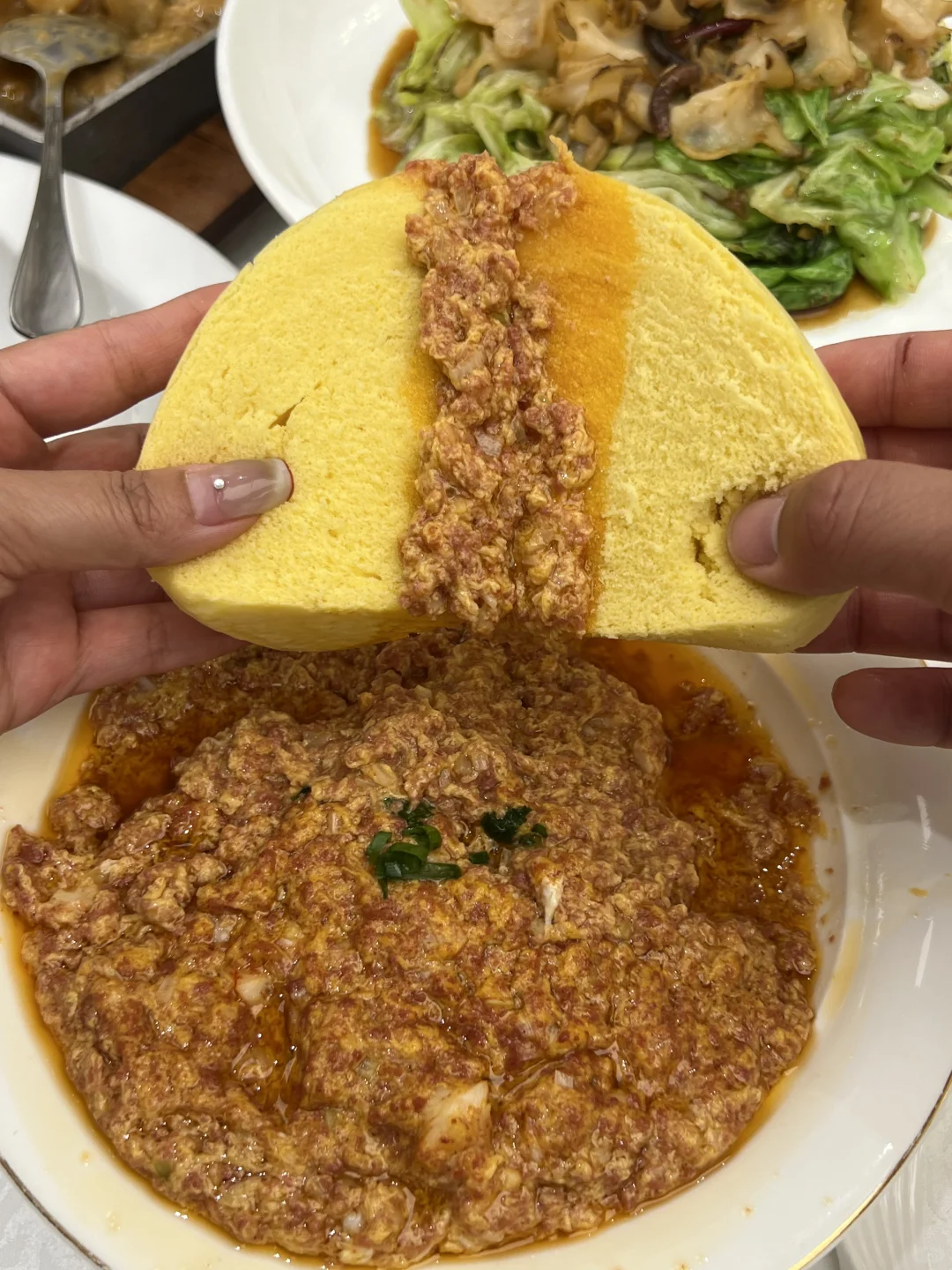 辽东虾酱馒头:虾酱做的很鲜,馒头煊软配上一整盘的蘸酱菜。小葱不辣微甜,黄瓜新鲜清新解腻。