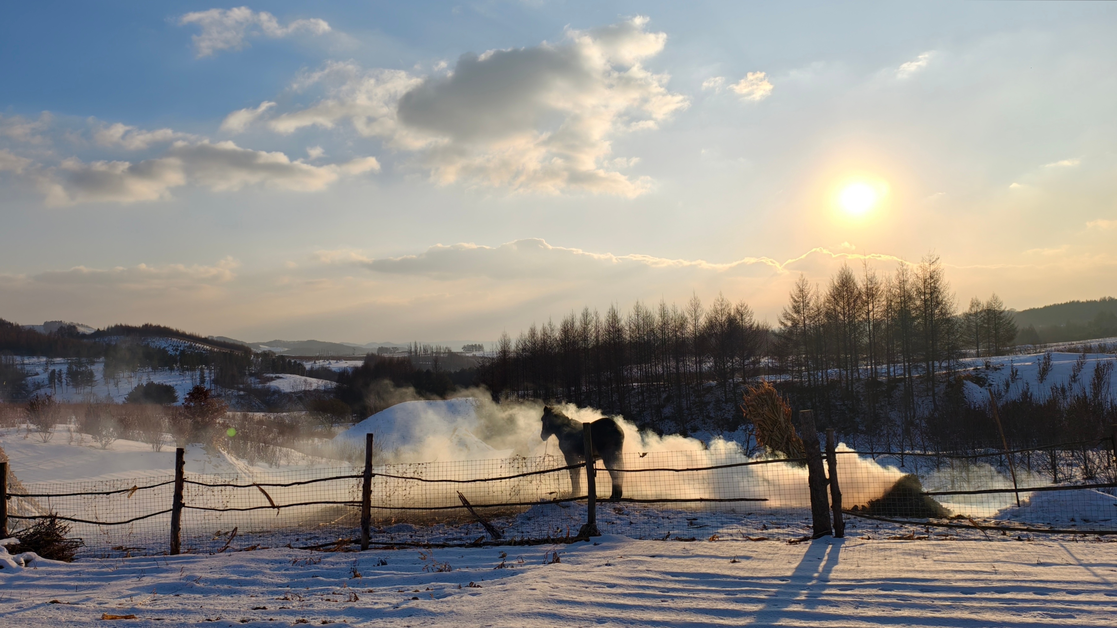 雪擅长把一切都变得特别干净,雪地里也特别安静,是天然的隔音海绵,在这样的环境下就会特别想找到一些活物。路边看到小狗小猫都非常亲切,这个时候看见一头在烟雾里的黑色骡子,在雪地里有一种特别神圣的感觉。