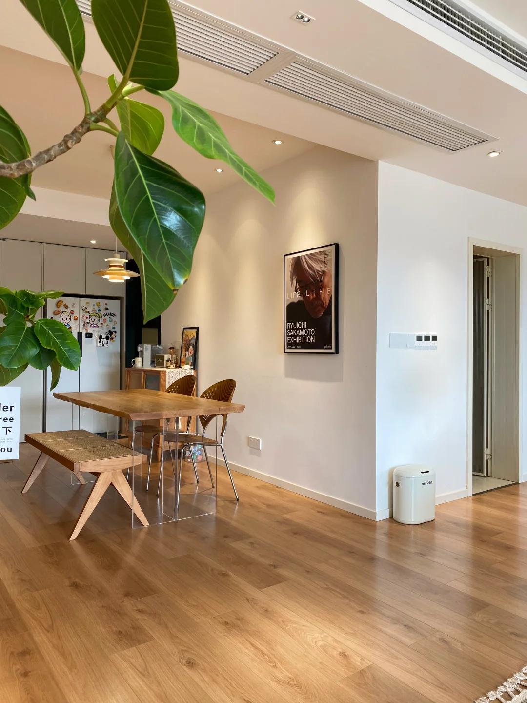 建面125㎡套内110㎡ 三房两厅两卫客餐厅一体的格局 打通阳台,全屋通刷大白墙,显大又通透 木地板通铺舒适感up! 家具色调统一再加上绿植点缀🪴 阳光洒进屋子真的清新又治愈 家里没有安装地暖,用电暖桌取暖也不错 每天回家后就钻进暖桌里,追剧、喝咖啡、吃东西 真的超级幸福鸭!