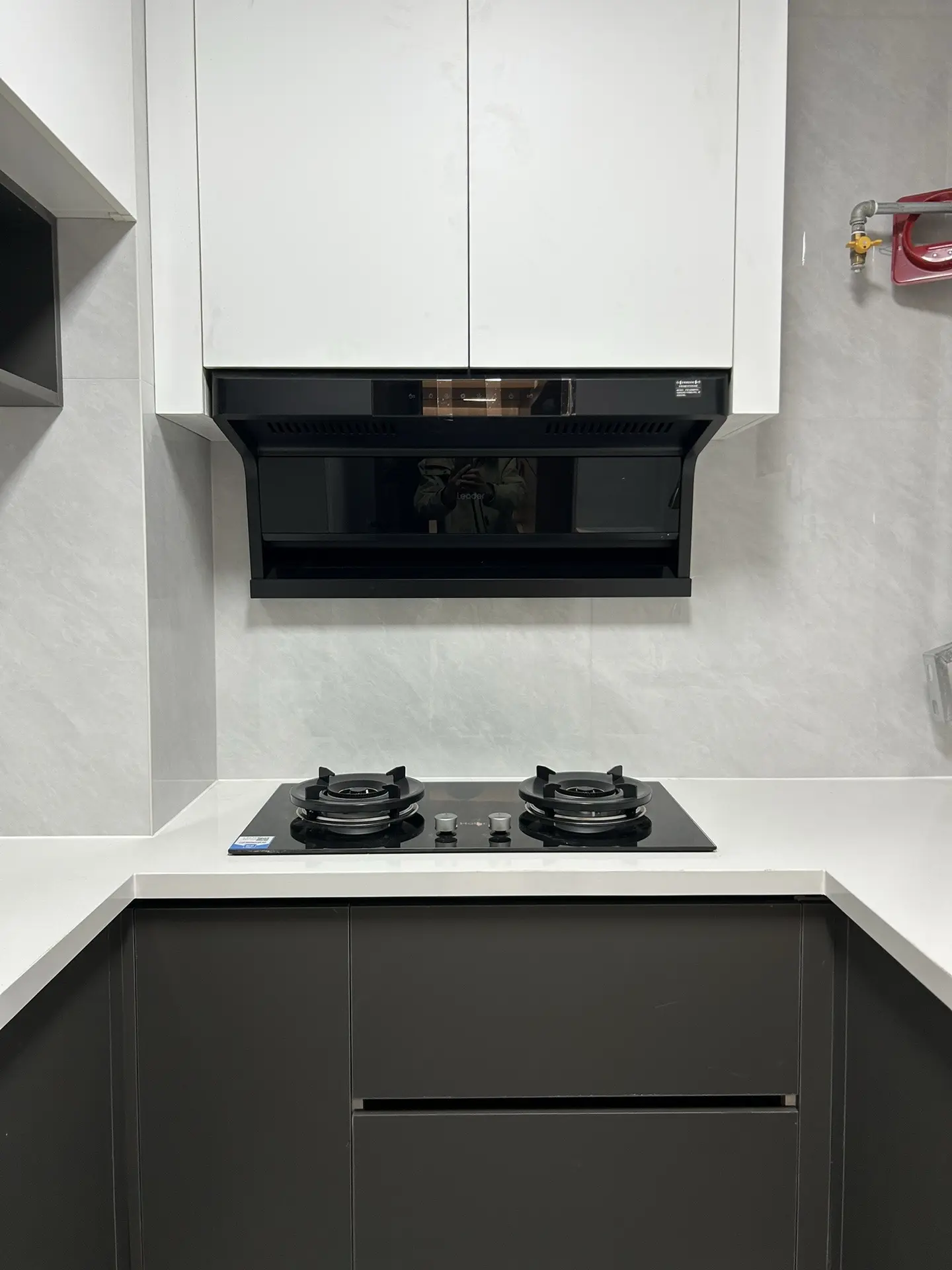 师傅在厨房修水管,女主人站在一旁。
