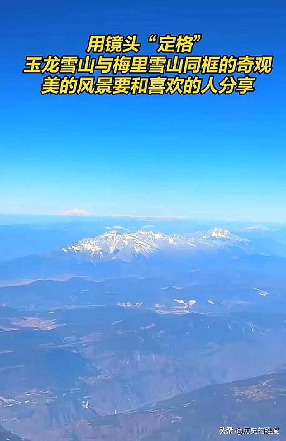 正所谓:山高路远,水阔河长。有些风景,是需要在特定角度,才能看得出,才能欣赏得到的。 下面的图片组就是这样一组美轮美奂的雪山航拍照片,这里面的主角分别是梅里雪山的主峰卡瓦格博和玉龙雪山。 它们都是云南的著名雪山,卡瓦格博是云南第一高峰,海拔6740米,也是横断山脉在云南境内的主峰,虽然它没有真正的主峰贡嘎山高,也是非常壮阔雄伟的,山形极其漂亮对称,被誉为最漂亮的雪山;玉龙雪山则海拔5596米,也是一座特别漂亮的雪山,是著名的旅游景点,每年都很多人到此旅游打卡。 如果光看照片,我不说,很多人会以为这两座雪山之间的距离只有几十公里,甚至有人认为视觉上最多只有四五十公里这样子。 其实事实上不是的,玉龙雪山与卡瓦格博峰的直线距离达到了230多公里,这基本属于广角镜头下,这个高度航拍下所能看到的极限了,地球大气边缘的蓝色弧形轮廓感都出来了。 这更体现了卡瓦格博山体的巨大,雪白的山顶极其耀眼,只有用肉眼才能感受的出这种大自然的波澜壮阔。