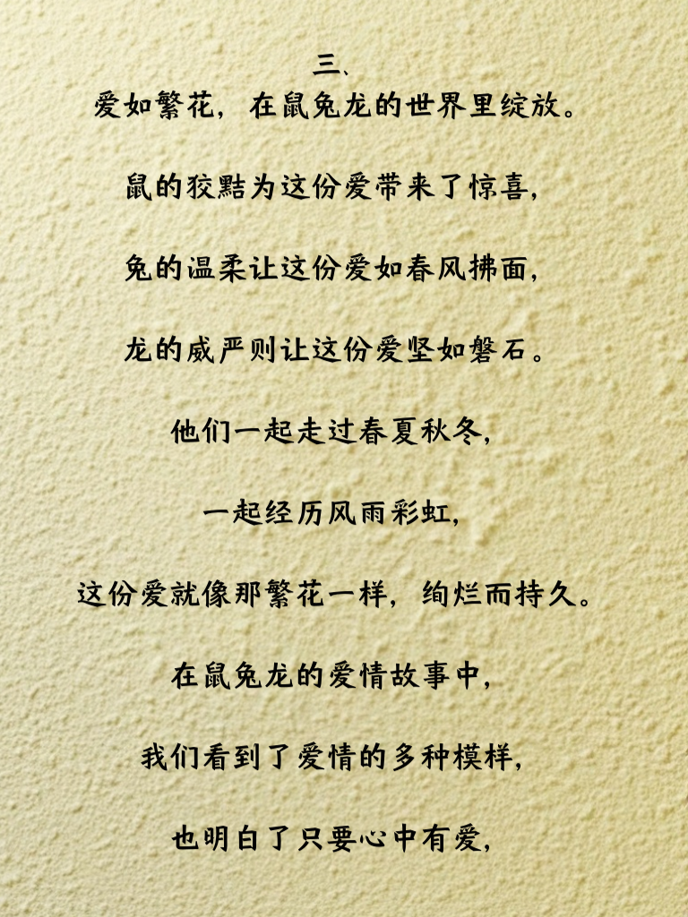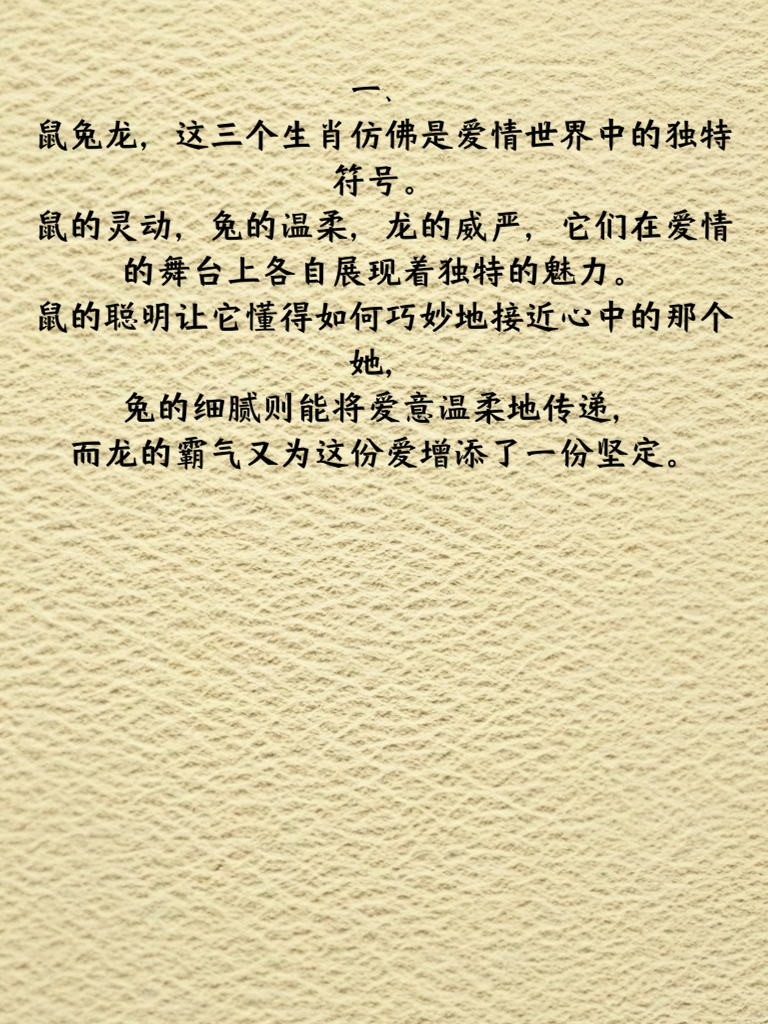 一、鼠兔龙,这三个生肖仿佛是爱情世界中的独特符号。鼠的灵动,兔的温柔,龙的威严,它们在爱情的舞台上各自展现着独特的魅力。鼠的聪明让它懂得如何巧妙地接近心中的那个她,兔的细腻则能将爱意温柔地传递,而龙的霸气又为这份爱增添了一份坚定。 二、当鼠遇见兔,那是一场心灵的契合。鼠的机智与兔的善良相互交融,仿佛在彼此的世界中找到了温暖的港湾。兔在鼠的陪伴下,不再害怕生活的风雨,而鼠在兔的温柔中,找到了心灵的栖息之所。当龙加入其中,这份爱变得更加磅礴,龙用它的力量守护着鼠和兔,让他们的爱情在岁月中愈发深厚。 三、爱如繁花,在鼠兔龙的世界里绽放。鼠的狡黠为这份爱带来了惊喜,兔的温柔让这份爱如春风拂面,龙的威严则让这份爱坚如磐石。他们一起走过春夏秋冬,一起经历风雨彩虹,这份爱就像那繁花一样,绚烂而持久。在鼠兔龙的爱情故事中,我们看到了爱情的多种模样,也明白了只要心中有爱,就能创造出属于自己的繁花似锦。
