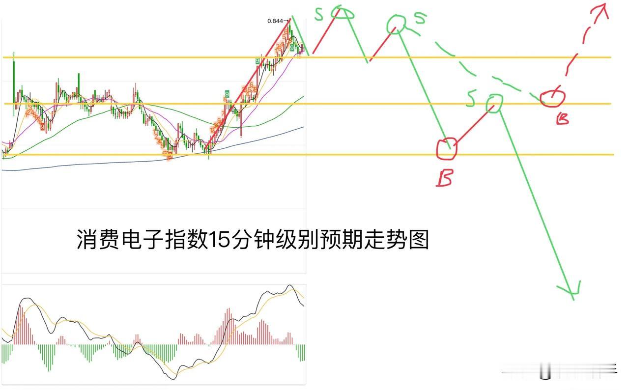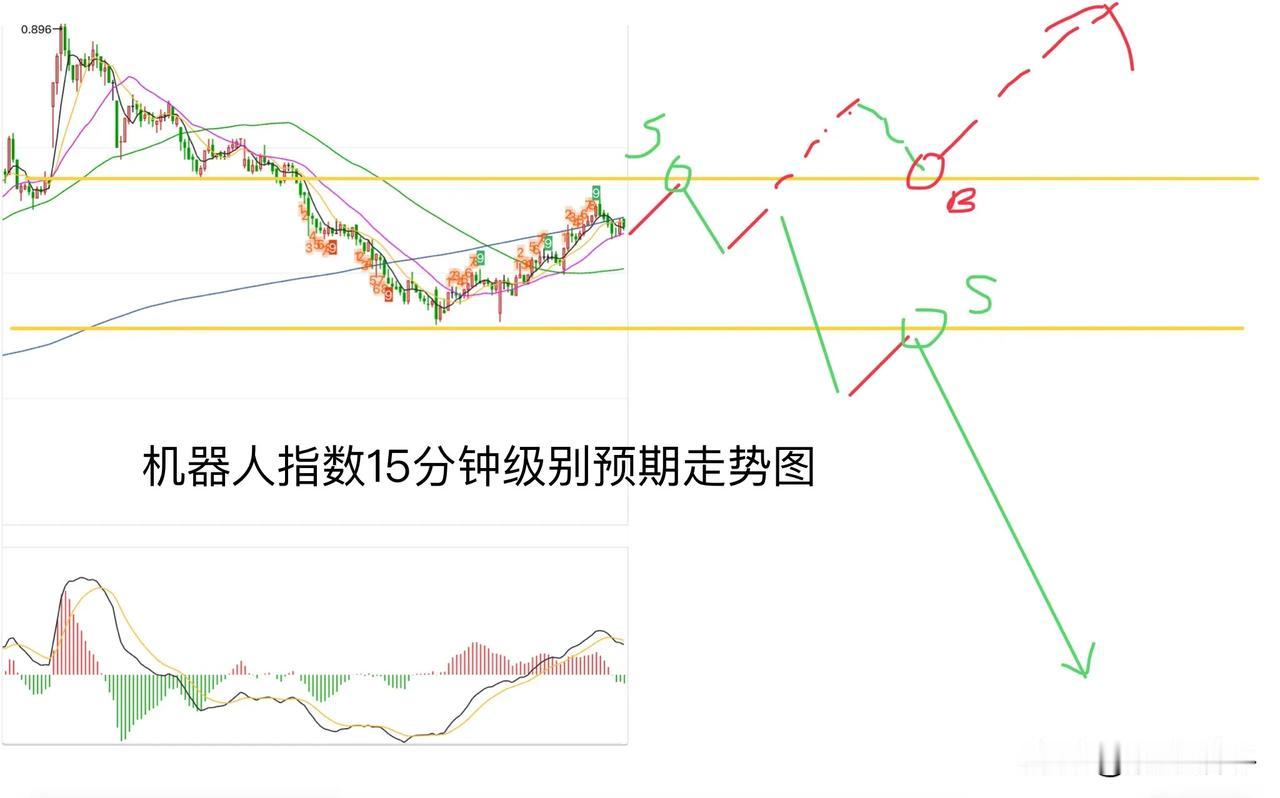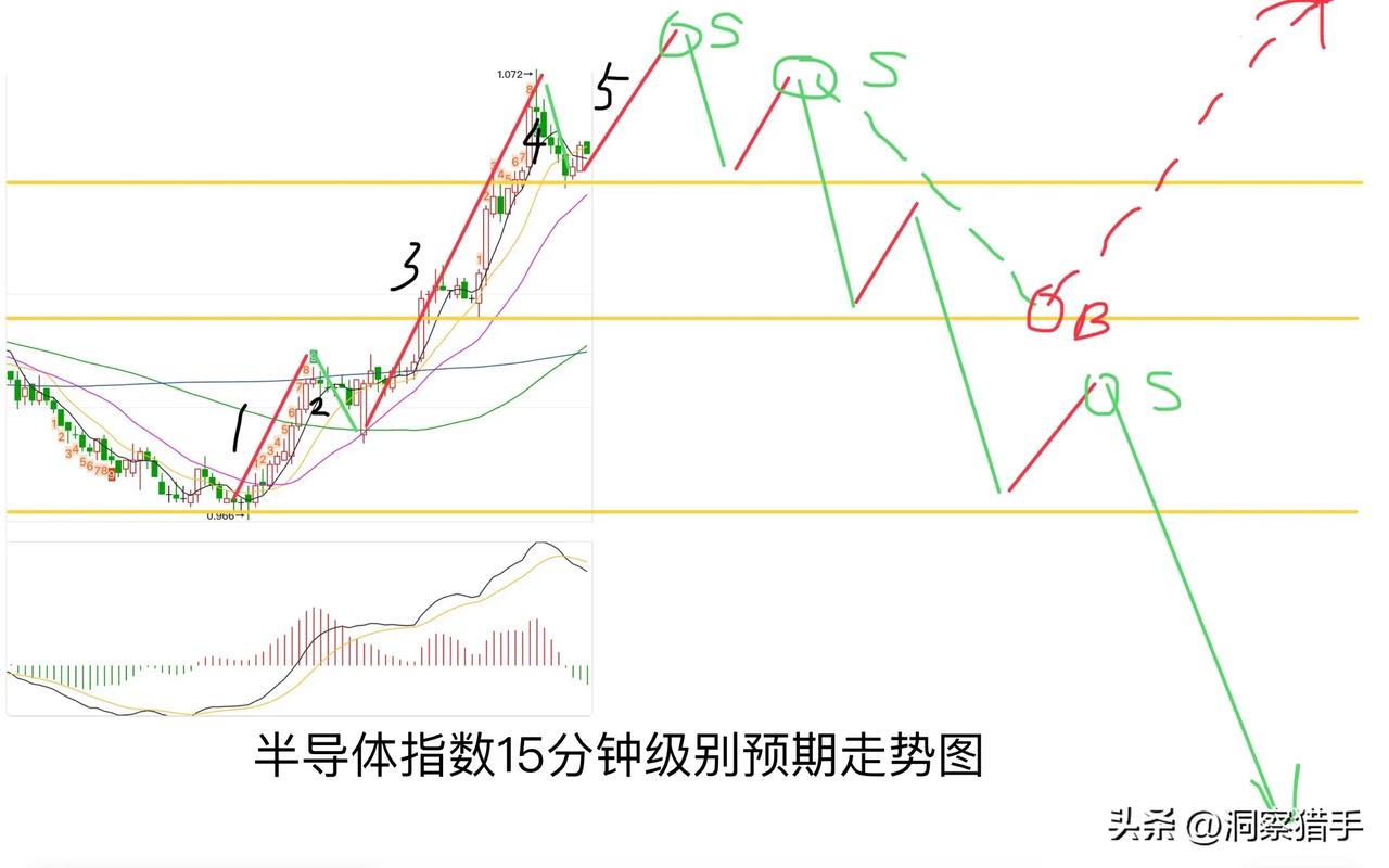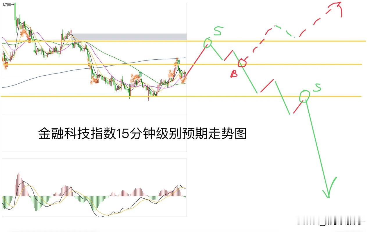 10月21日周末分享,生死一线,下周见分晓,向上最多是短期踏空,向下就是万丈深渊,做好策略应对,切勿鲁莽行事,周五尾盘虽已提示B的操作,但是一旦出现向下的倾向,请立即执行S操作,果断止损出局! 先看一下上证指数,图面为15分钟级别预期走势图,很清晰的可以看出。目前只运行了15分钟级别123下跌的1浪下跌,基本可以确认结束了,当前运行的有可能就是2浪调整中枢,后面是有概率直接出现3浪下跌的,而且如果成形,将是自9月底以来最大的分时级别主跌浪,小心谨慎为宜! 消费电子指数不用太过纠结,走势与半导体指数同步,这两个指数就是有福同享,有难同当的节奏,过程有些偏差,但是最终仍然趋于一致,参考15分钟级别的预期走势图就好!从上证指数日线级别来看,或许还有一线生机,因为上周的调整并没有跌破20日均线,如果下周放量反弹就会出现上周所说的日线级别3浪上涨,当然即使出现3浪上涨也是S点,这个是毋庸置疑的,还是那句话周线级别的乖离率必须修正! 机器人指数当前的上方压力位非常明显,如果在当前这个位置反复震荡,做一个中枢结构就有可能出现继续补涨的可能性,15分钟级别预期走势图,如果这个压力位迟迟无法突破并且守住,那么必然会继续向下深度洗盘,后面行情应该小不了,前期量能巨大,最起码跌下去也会有一个双顶走势! 金融科技指数下周一很关键,如果真要带着大盘上证指数向上做日线级别3浪上涨,那么下周一必须出现放量大阳天突破当前位置,只有突破这个压力位,那么才有机会震荡调整之后再次向上继续冲高。 15分钟级别预期走势图目前属于空头走势,生死一线的位置,一旦周一周二继续向下,即使不出现大跌,那么日后也很难有所作为,所以,下周一开盘必须大涨出现,要不然神仙也救不了,如果大盘上证指数的15分钟级别震荡中枢一旦形成,就会出现主跌浪大幅调整,所以要小心谨慎啊,大盘能否有行情,金融科技指数就是先行指标,如果他的不作为,大盘上证指数有难有所作为,所以小心为妙! 半导体指数本周已经抄底完成任务,也算是补涨了,那么下周一大概率的走势就是冲高回落,或者直接向下调整,这取决于大盘上证指数的方向选择。从15分钟级别预期走势图来看,即使下周要大涨也要经过震荡调整之后才能有所表现,所以切勿追高,等待调整结构出现再做试错参与。 但是一旦关键支撑位有效跌破,那就不可以参与!