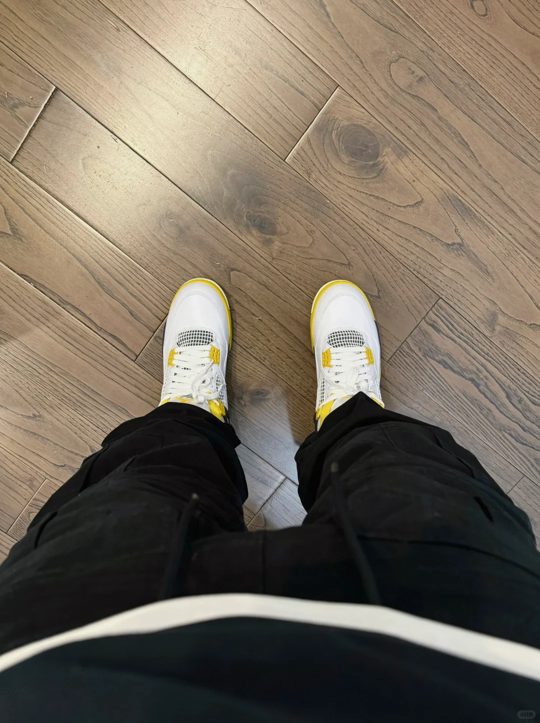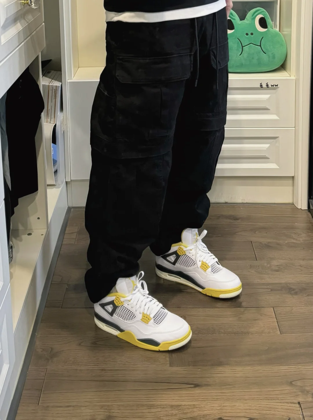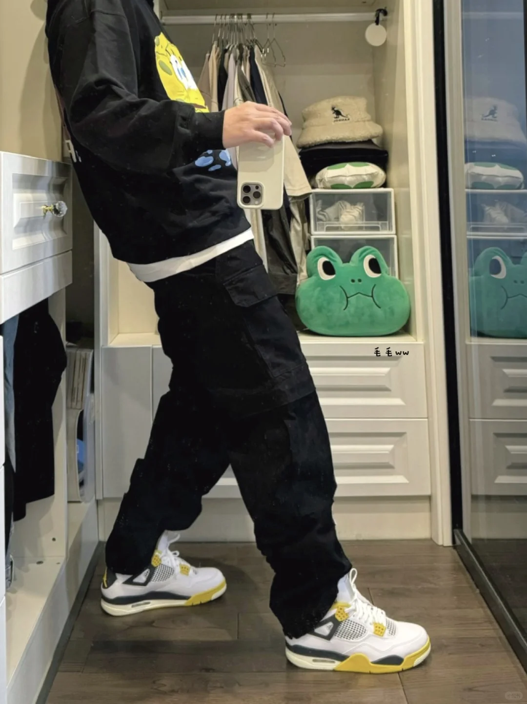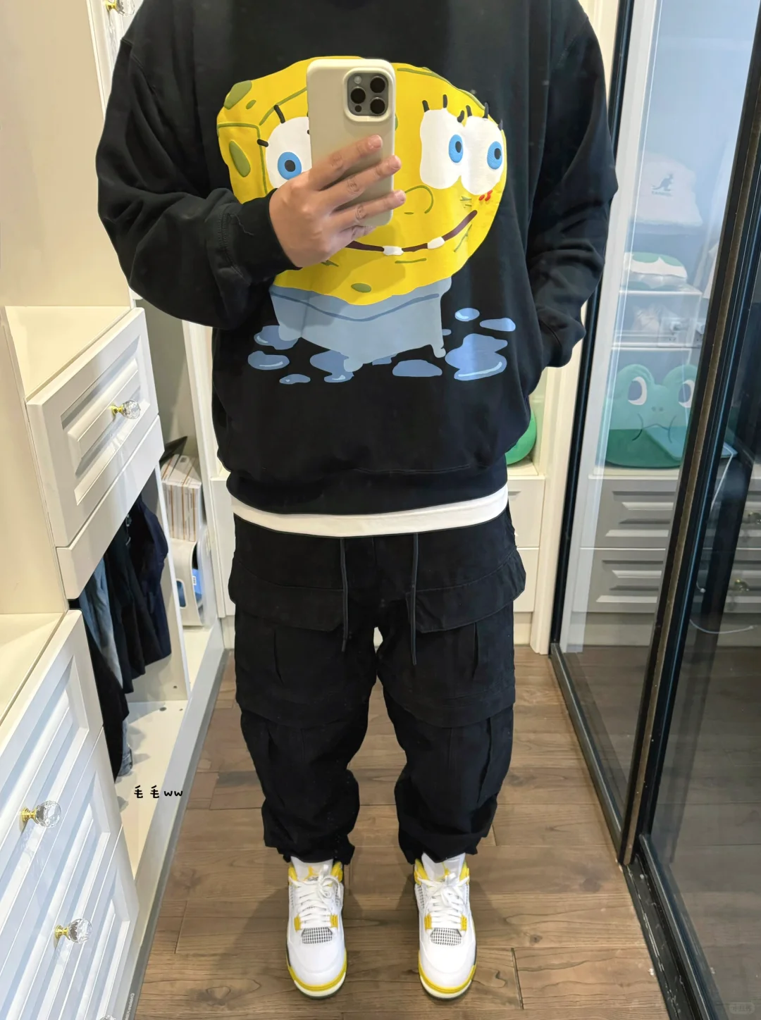 -四眼海绵宝宝,这次合作系列中喜欢的图案,可爱中略显夸张,张力够够的 . -连帽卫衣&口袋工装,黑色系轻松搭配;再挑双乔四,配合海绵宝宝的黄色 . —————— . ✏️本人178cm75kg 球鞋尺码265mm(正常EU42) . 💭以上均为我个人观点,不喜勿喷,欢迎讨论。