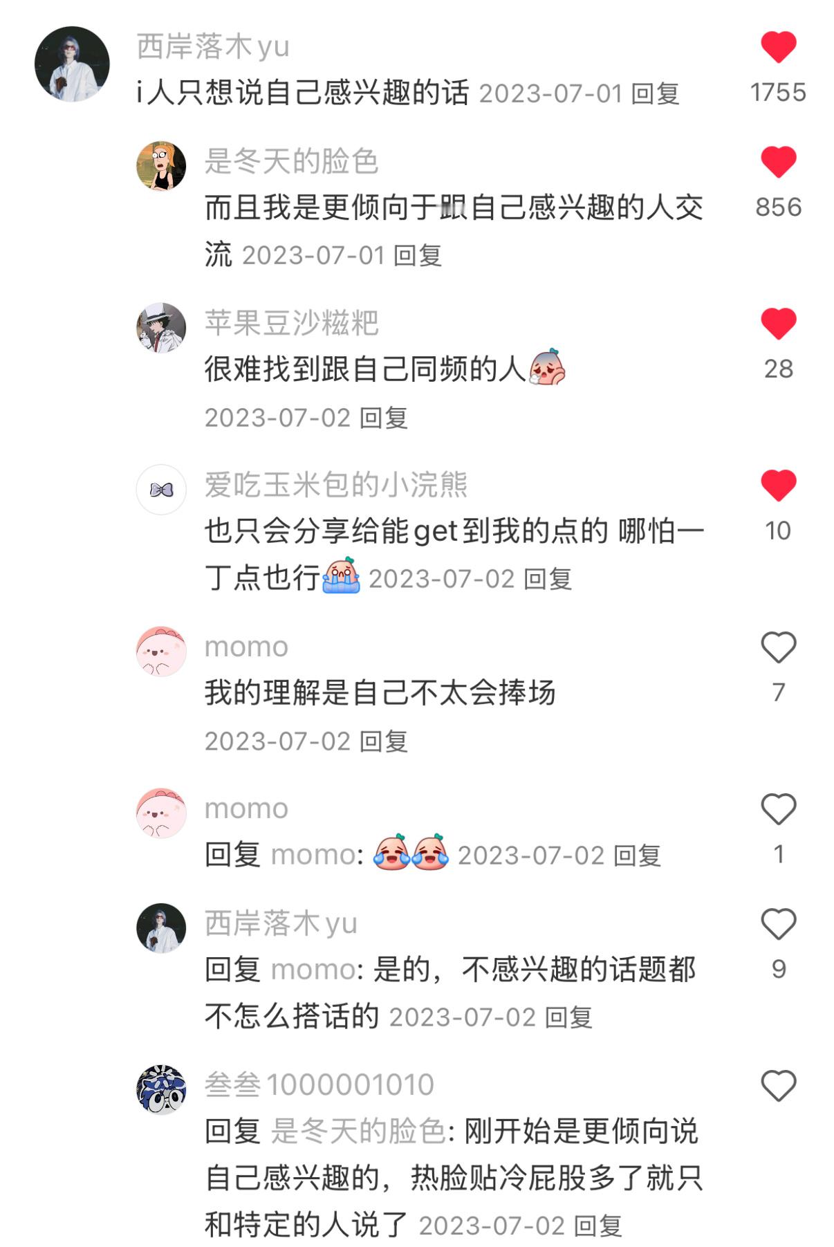 发现i人其实不是不喜欢说话 “不认识哑巴,熟了之后喇叭”,i人是会对合眼缘的人主动的,同频对我们真的很重要。即使成为了朋友,在相处过程中也依旧会慢慢观察身边的人到底适不适合自己,如果非常不合适,可能就会选择果断抽身疏离🥲