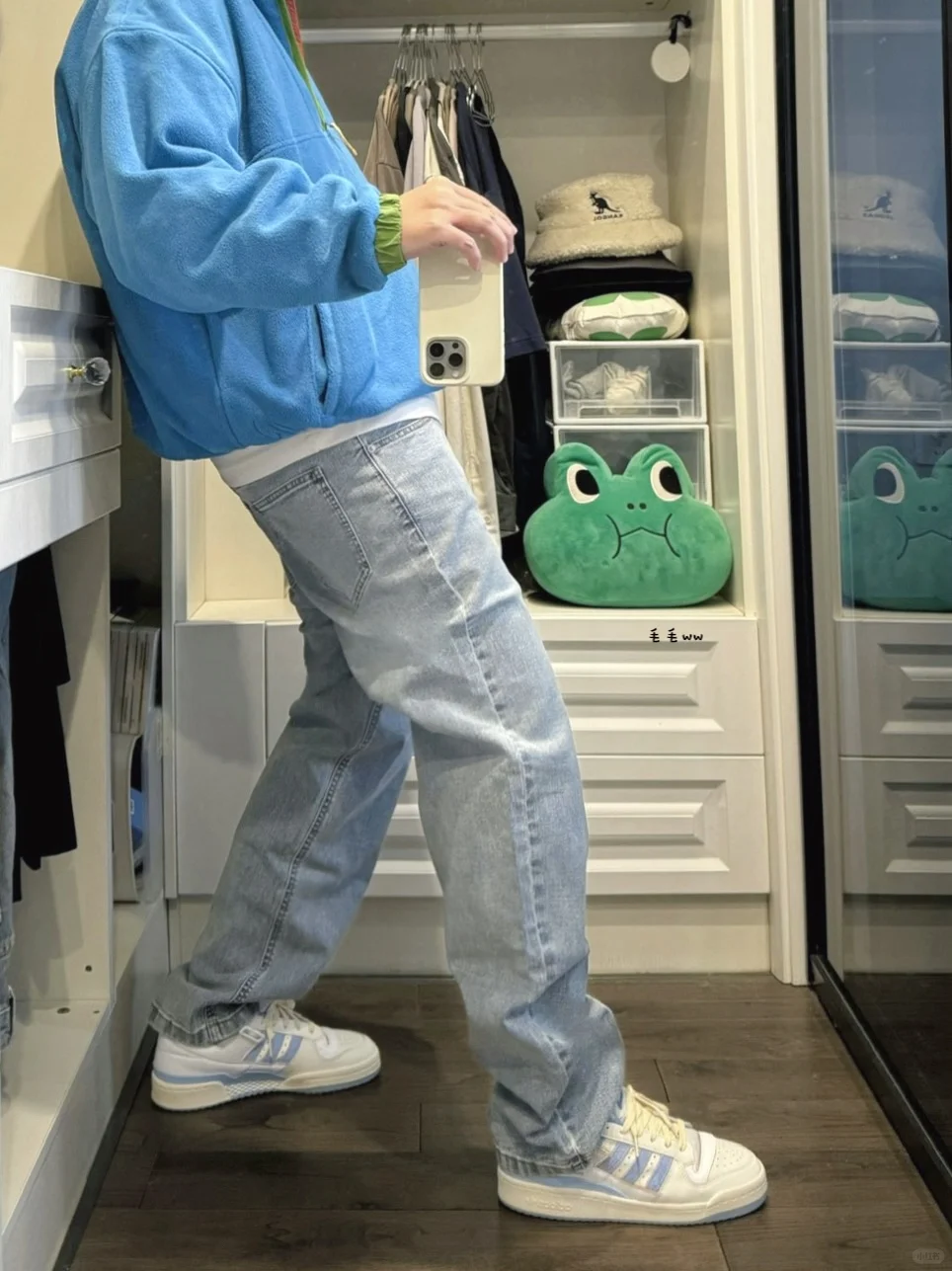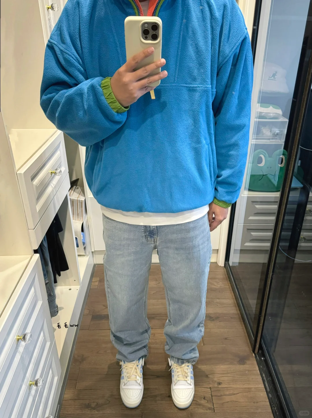 -蓝色系显年轻,念书时候就爱穿,半拉链的摇粒绒夹克,双面穿很实用 . -牛仔裤选了一条浅蓝,清爽的同时也能搭配整套色系,直筒版型不挑鞋轻松搭 . —————— . ✏️本人178cm75kg 球鞋尺码265mm(正常EU42) . 💭以上均为我个人观点,不喜勿喷,欢迎讨论