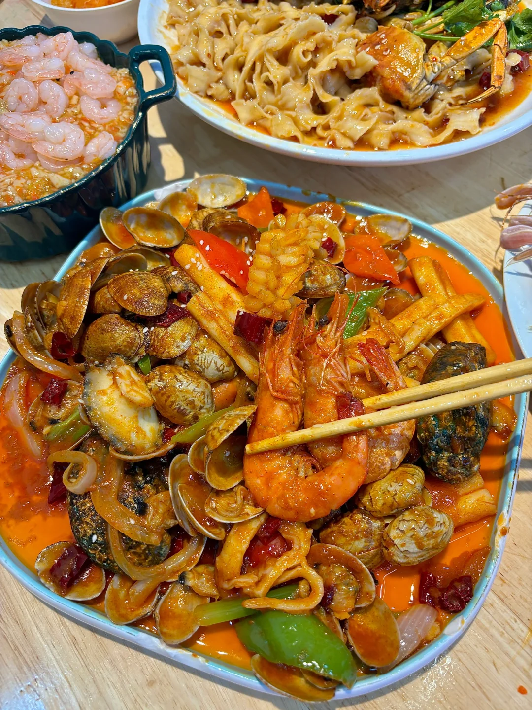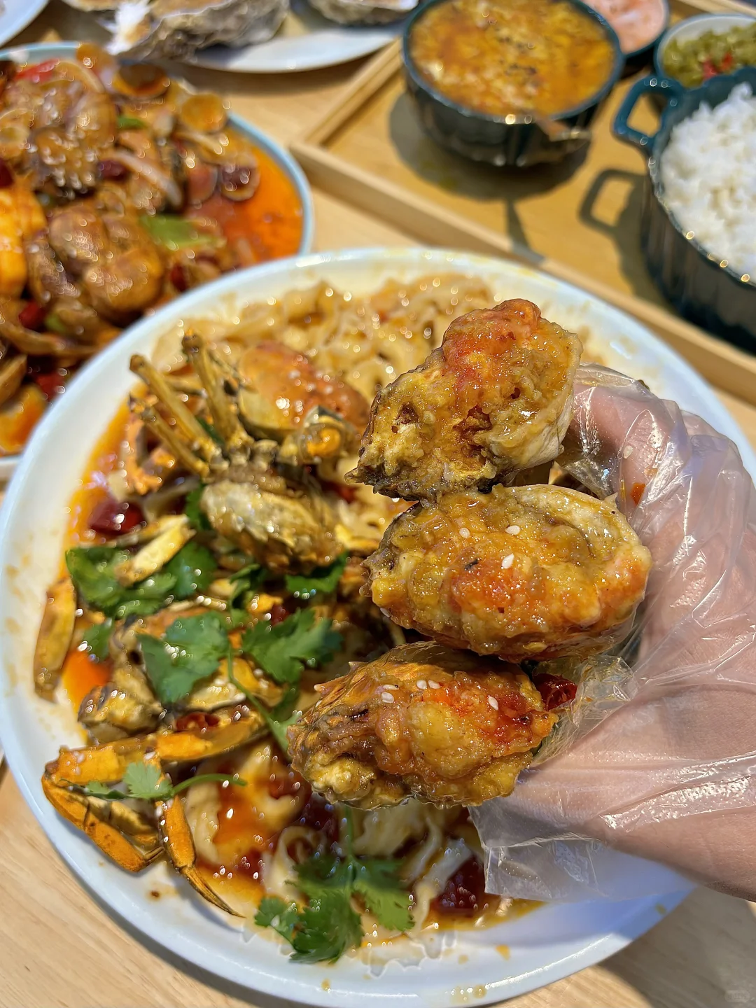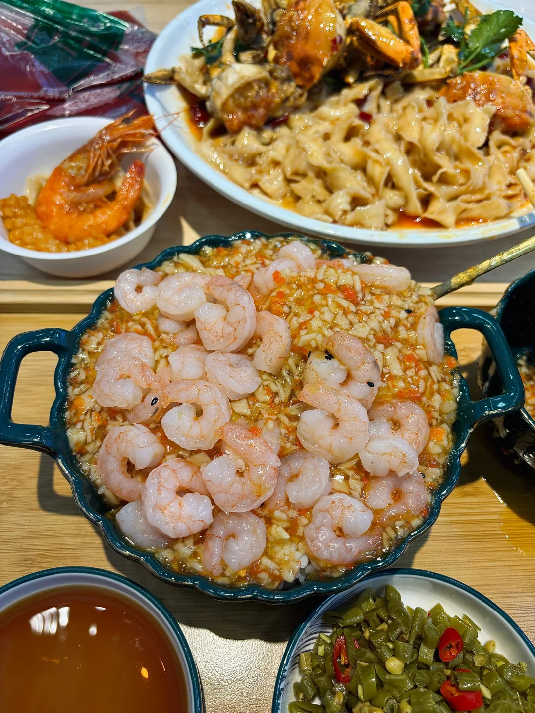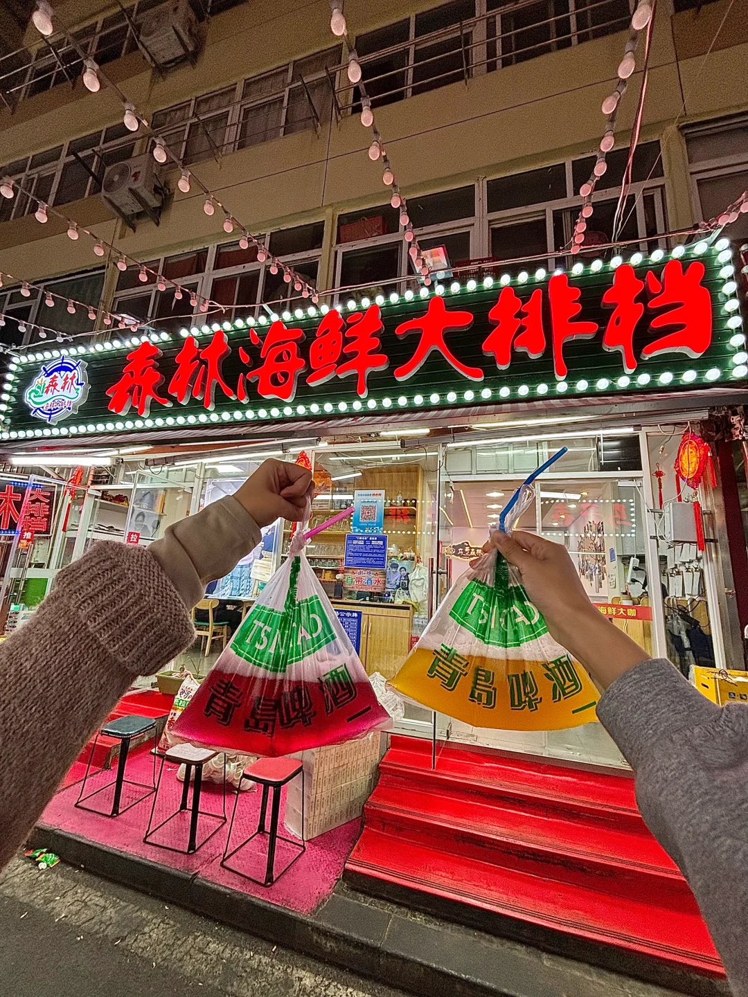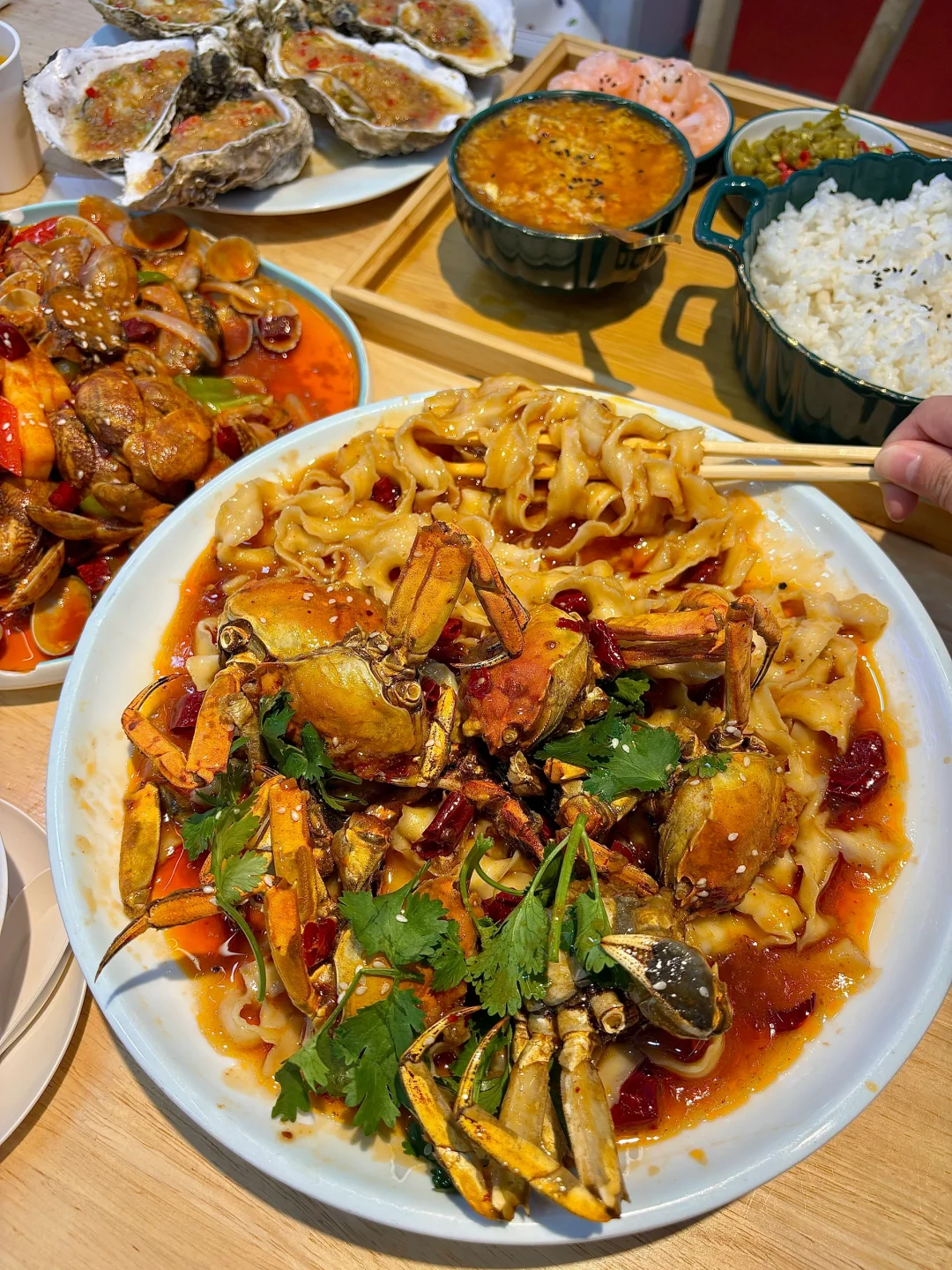 果然越是这种路边不起眼的小店口味越好… 我们晚上一进门看到坐满了本地人就知道没走错,都是明码标价的,完全不用担心被坑!! 一定要试试香辣蟹拌面,每一只螃蟹都是又大又肥的那种,满是蟹黄吃起来好过瘾😭😭 还有皮皮虾、海鲜炒年糕、蟹黄拌饭等等都不错,跟朋友一边吃一边夸,下次来青岛玩还是会选这家!!(叫:森林海鲜大排档)