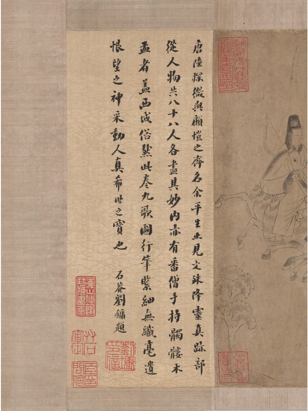 末图的刘墉题跋:唐陆探微与顾恺之齐名,余平生止见文殊降灵真迹,部从人物共八十八人,各画其妙,内亦有番僧手持骷髅木盂者,盖西域俗。然此卷《九歌图》,行笔紧细,无纤毫遗恨,望之神采动人,真稀世之宝也。石菴刘镛题