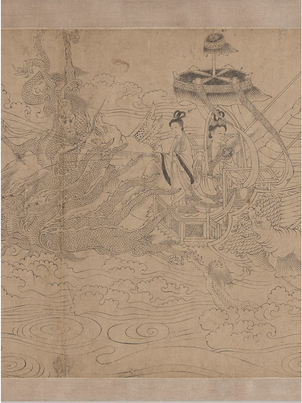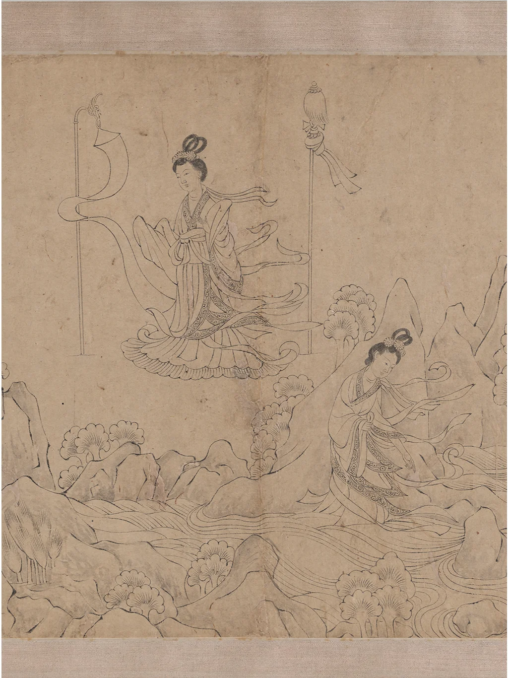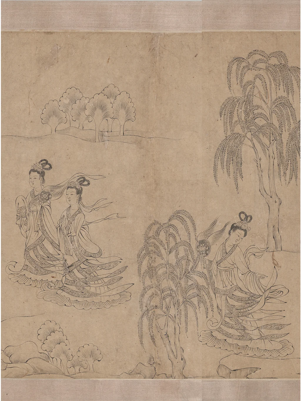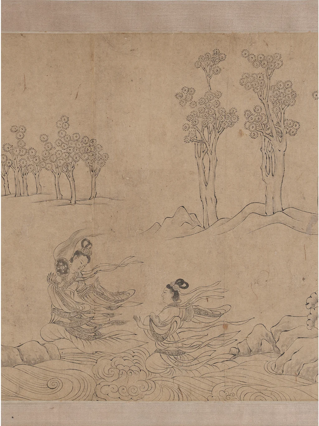 美国弗利尔美术馆的洛神赋白描卷有两个文档,博物馆编号分别是F1968.12和F1968.22,官网对两幅画的说明基本一样。F1968.22的内容恰好也是洛神图最后一幕的“东归”,对于画幅长度也说明是两幅图共533.6cm(“H x W (image, F1968.12 and .22): 24.1 x 533.6 cm ”)。拼在一起,这就是历代《洛神赋图》九大传世古本中唯一的白描本。据现代学者的考证,该画是李公麟摹临,底本为陆探微《洛神图》样唐代摹本。