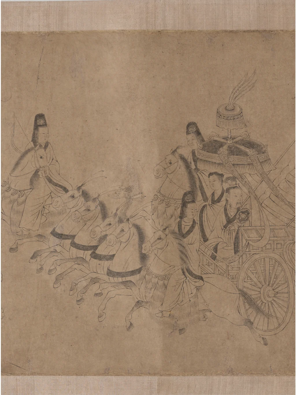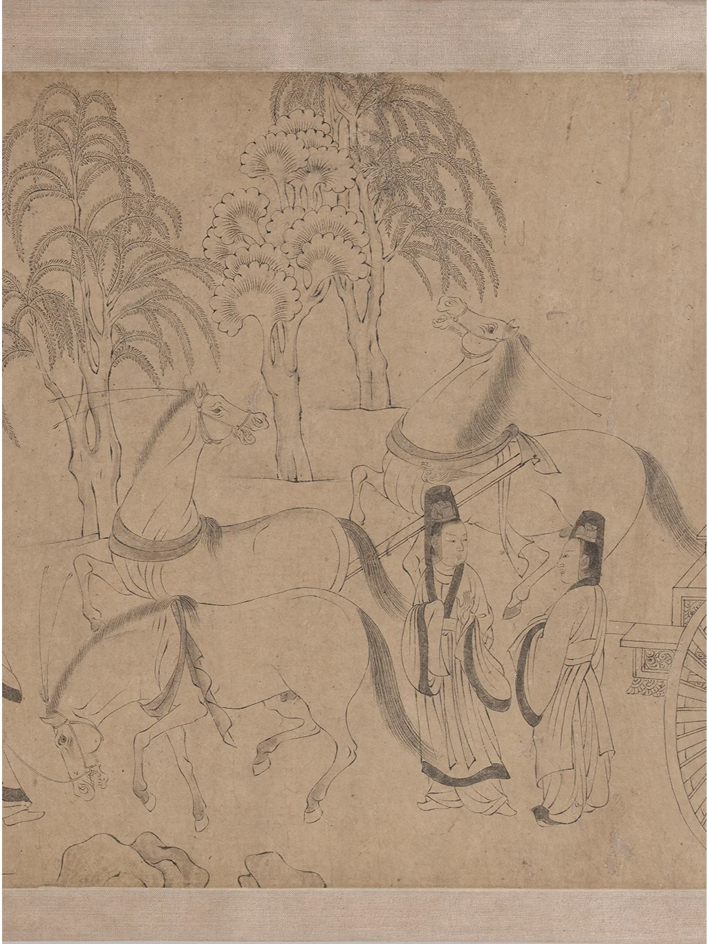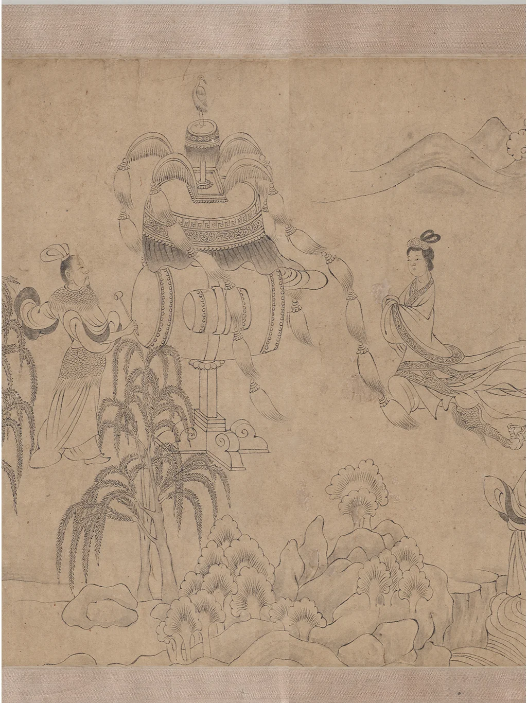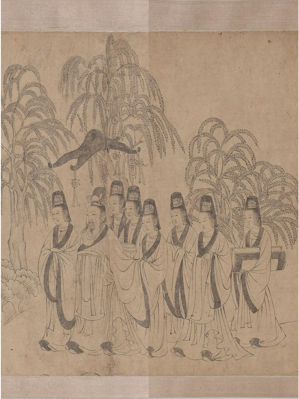 美国弗利尔美术馆的洛神赋白描卷有两个文档,博物馆编号分别是F1968.12和F1968.22,官网对两幅画的说明基本一样。F1968.22的内容恰好也是洛神图最后一幕的“东归”,对于画幅长度也说明是两幅图共533.6cm(“H x W (image, F1968.12 and .22): 24.1 x 533.6 cm ”)。拼在一起,这就是历代《洛神赋图》九大传世古本中唯一的白描本。据现代学者的考证,该画是李公麟摹临,底本为陆探微《洛神图》样唐代摹本。