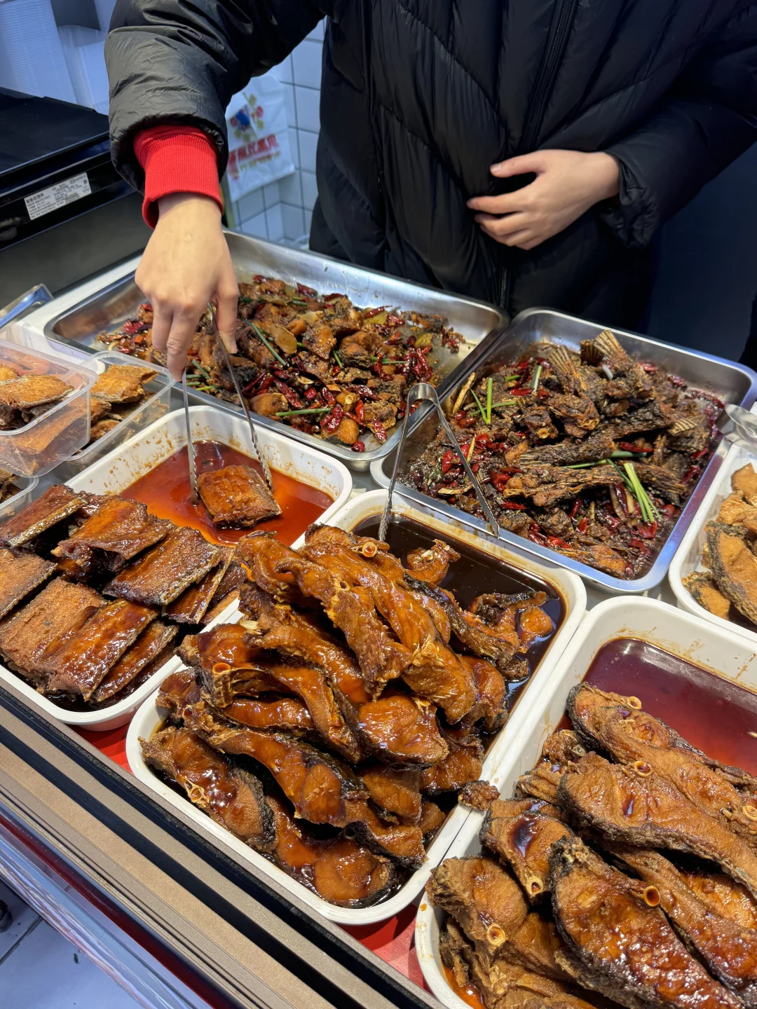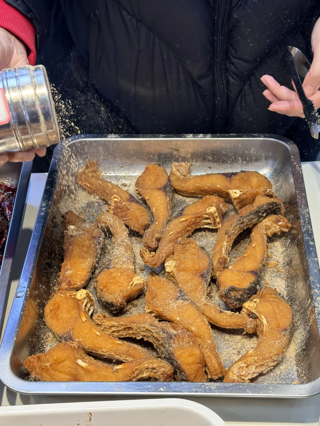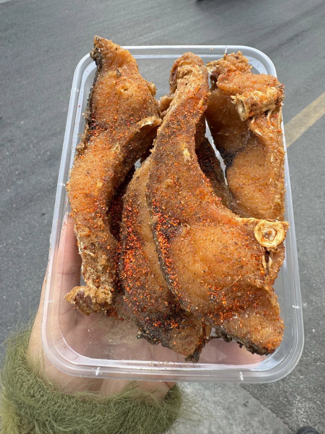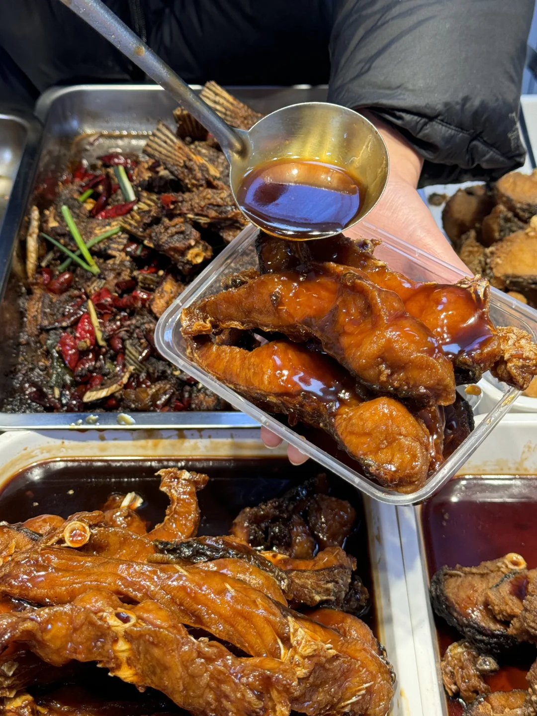- 真的好爱这家熏鱼,新鲜的熏鱼现炸,块头特别大。 糖醋熏鱼,酸甜可口,酱汁很浓稠。 检盐熏鱼,这个一定要趁热吃,炸得特别酥脆,撒上椒盐和辣椒粉,很适合当追剧小零食。还吃到了麻辣口味的,很特别。 -