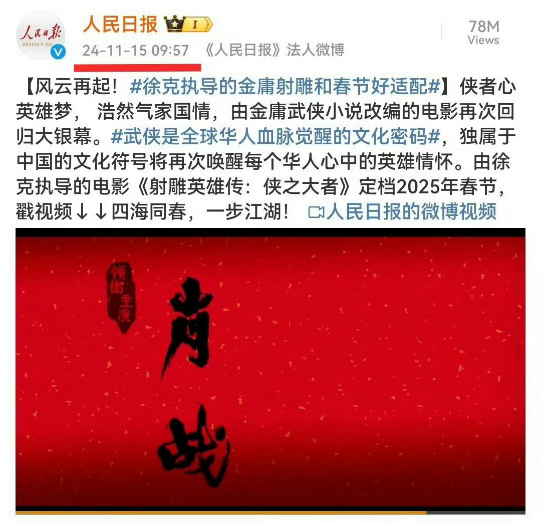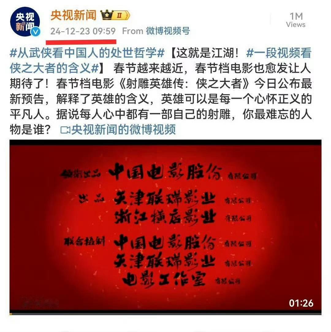《射雕英雄传-侠之大者》太牛了,人民日报、央视新闻前后脚卡点发布,仪式感满满[赞][赞][赞]