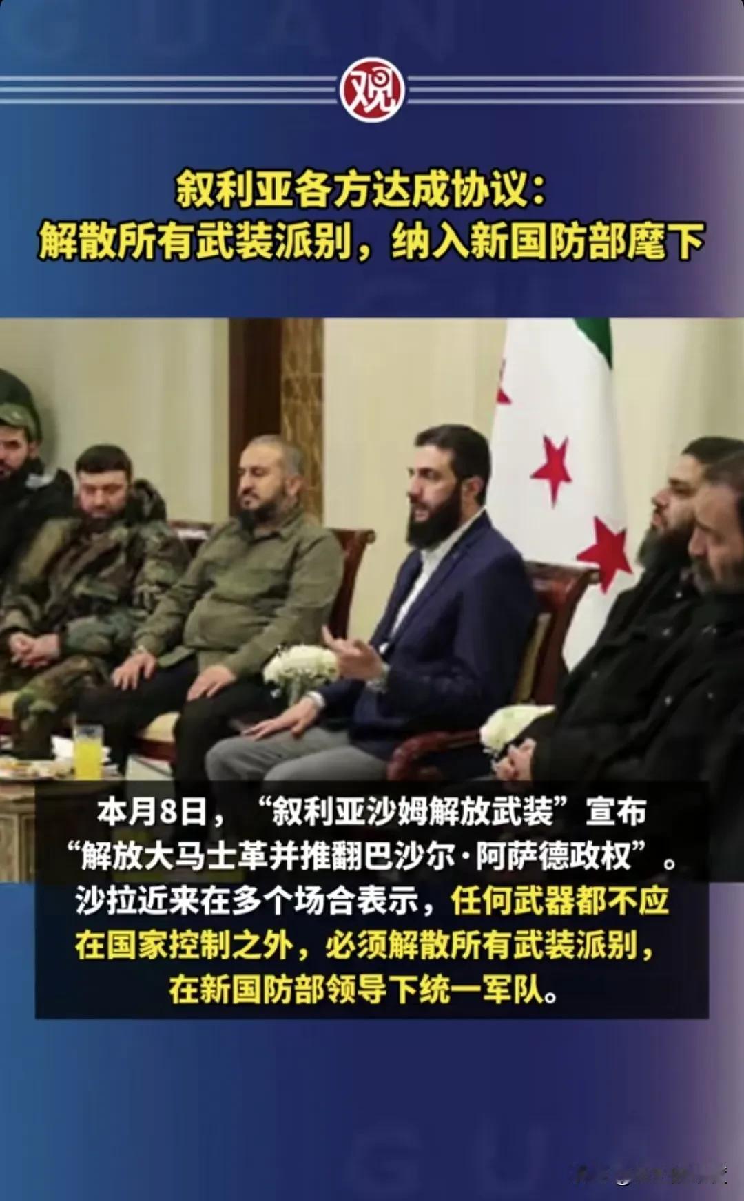 朱拉尼经过一周的时间的工作与动员,从当地时间12月17日到当地时间12月24日,完成叙利亚各派别武装部队整合收编的艰巨任务。 这是他跨过的第二座大山,第一座大山为推翻阿萨德政权,两座大山所花时间都没有不长,基本各为一周时间左右,速战速决。 当地时间12月24日,根据叙利亚国家通讯社的消息,叙利亚各武装派别已经与叙利亚临时总统朱拉尼达成了协议,接受其收编与安排,这些武装派别将被解除全部武装,人员与官兵将归入叙利亚新国防部统一管理。 在一周前,他的亲信哈马维就做了表率,第一个率领沙姆解放组织全部解散,率先并入叙利亚新国民军队,随后多支反对派武装力量追随,采取了同样的做法,其他的各支武装派别,一看这情况,没有谁敢不跟的。 这样一来,朱拉尼已经可以基本上控制叙利亚全部军队了,他会迅速让局势平稳下来,好开启与国际各国的正常邦交,并尽力再处理一些边境争端,争取最大力度,吸收外援,重新做好叙利亚的基础建设,激活叙利亚的经济,才是未来他重中之重的工作,只有做好这些,才算是真正的成功。冬日生活打卡季 叙利亚局势 叙利亚的未来之路在哪里?