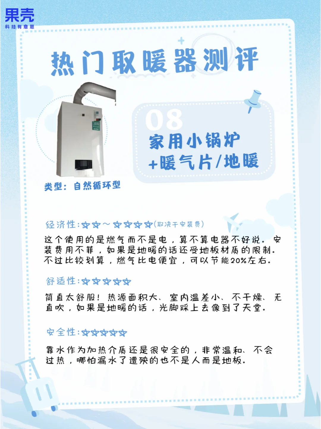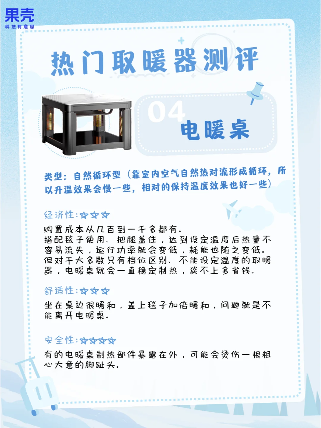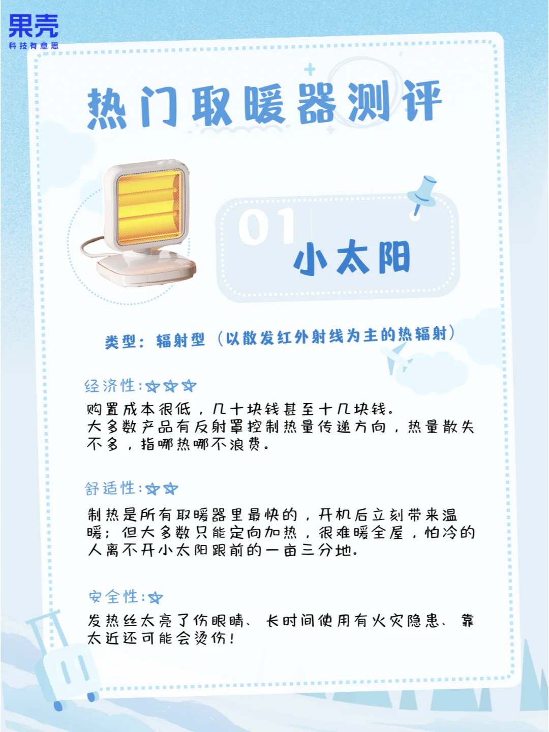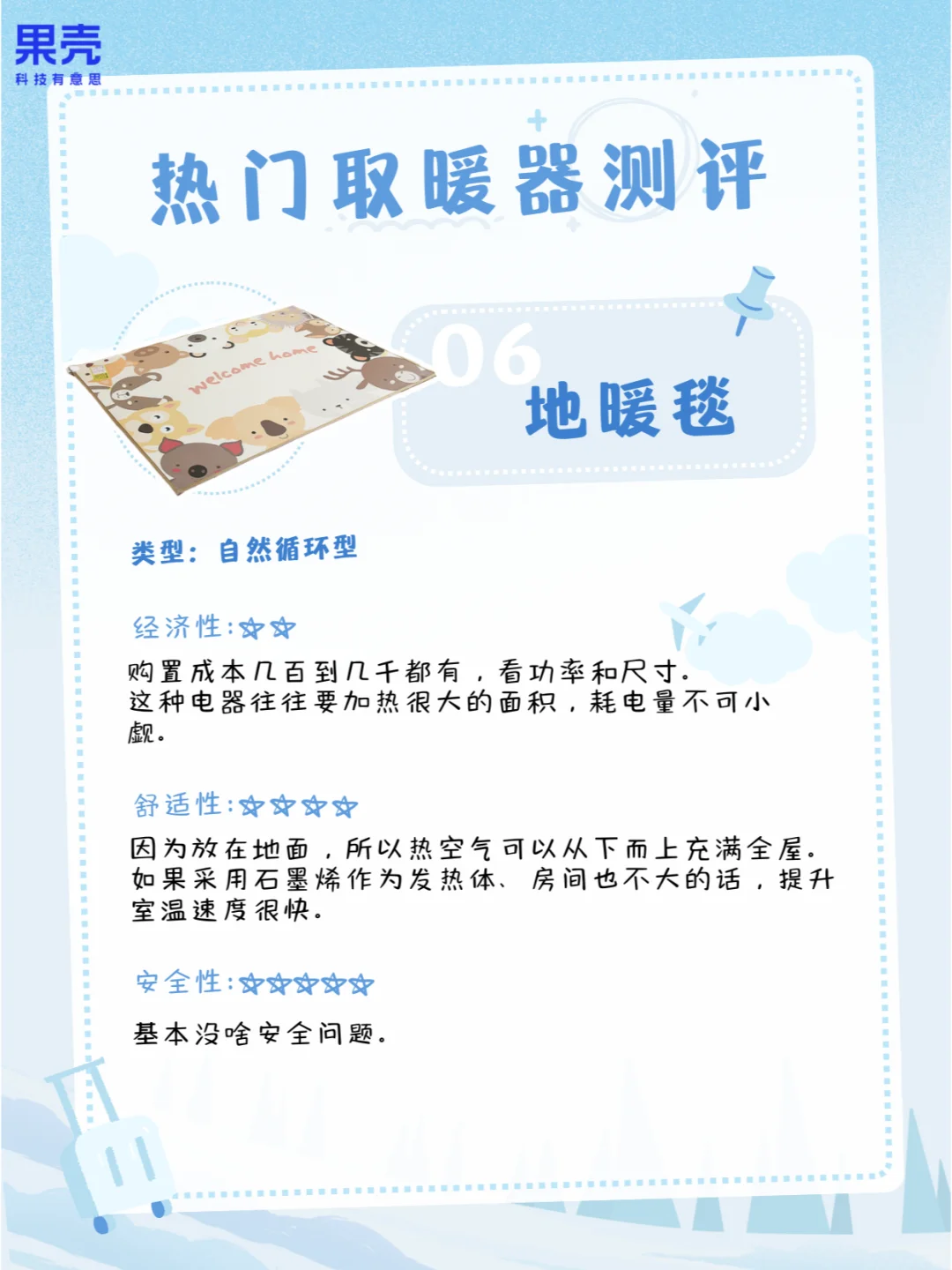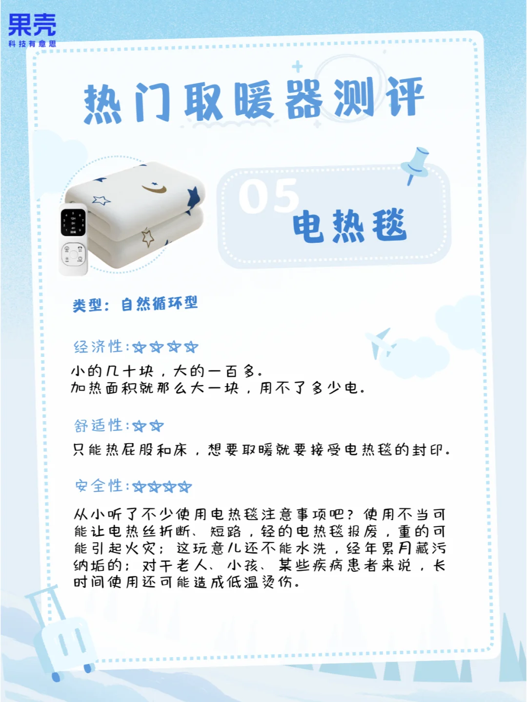 买的时候要选有3C认证的,最好有冷壳隔热(防烫伤)、过热断电(防烧毁)、阻燃材料(防火灾)、倾倒断电(防意外)这些额外特性;使用时候也要认真读说明书,比如不要长时间使用、别手贱去乱摸、没防水功能就别在浴室用、别靠着取暖器睡觉,以及让婴幼儿远离取暖器。知识俱乐部 自然科普考察站 科普 家用电器分享 取暖 电热毯 小太阳