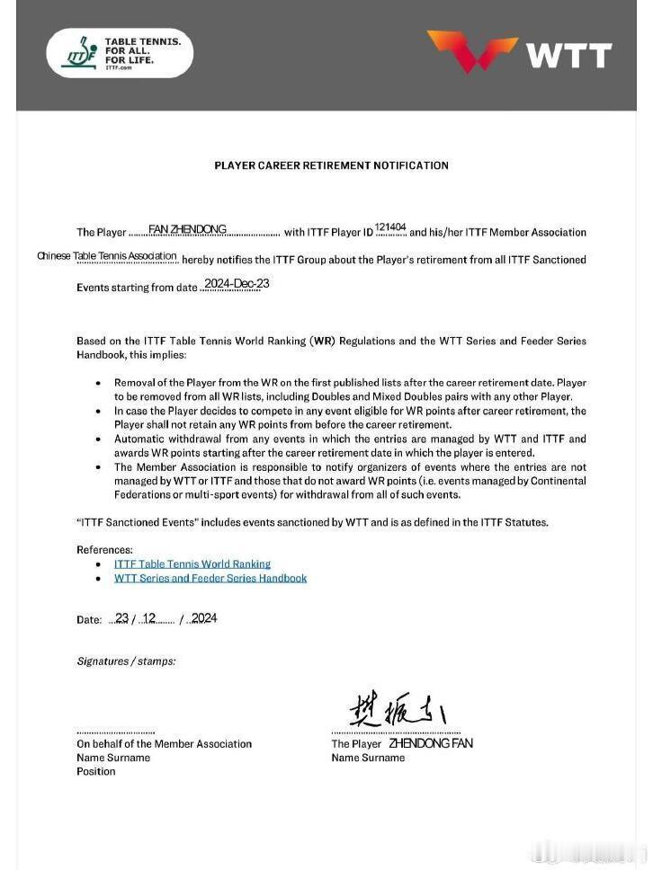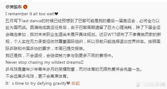 五月写下last dance的时候已经预想到了巴黎可能是我的最后一届奥运会,必将全力以赴为国而战。圆满完成奥运任务后,由于巴黎周期遗留了巨大心理消耗,除了下届全运会确定参加,我对未来职业生涯尚未展开具体规划。近日WTT颁布了不参赛就罚款的新规,个人实在无力承受但依然尊重国际组织,所以目前只能选择退出世界排名。按照国际乒联和中国乒协的要求,本周已提交报告。