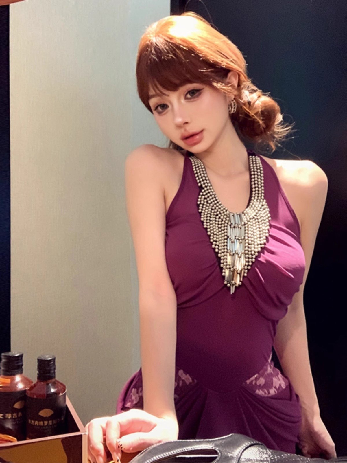 法式钉珠挂脖连衣裙女冬季高级感气质名媛