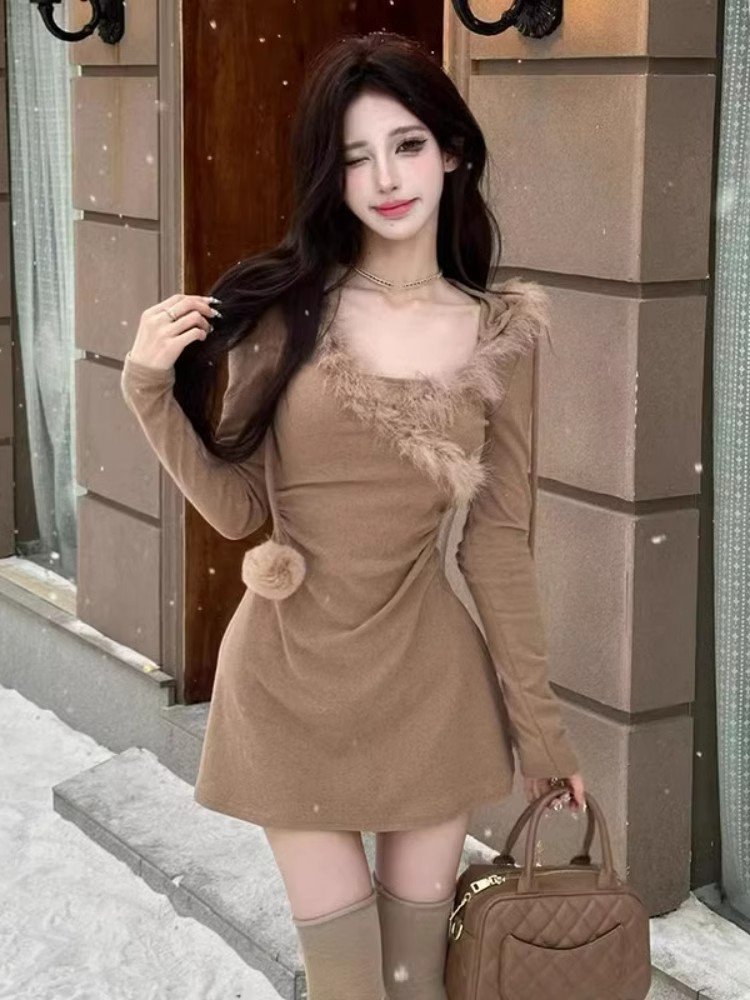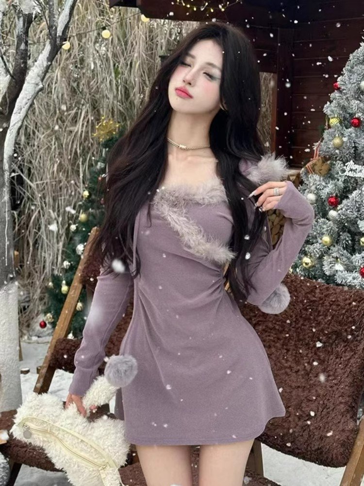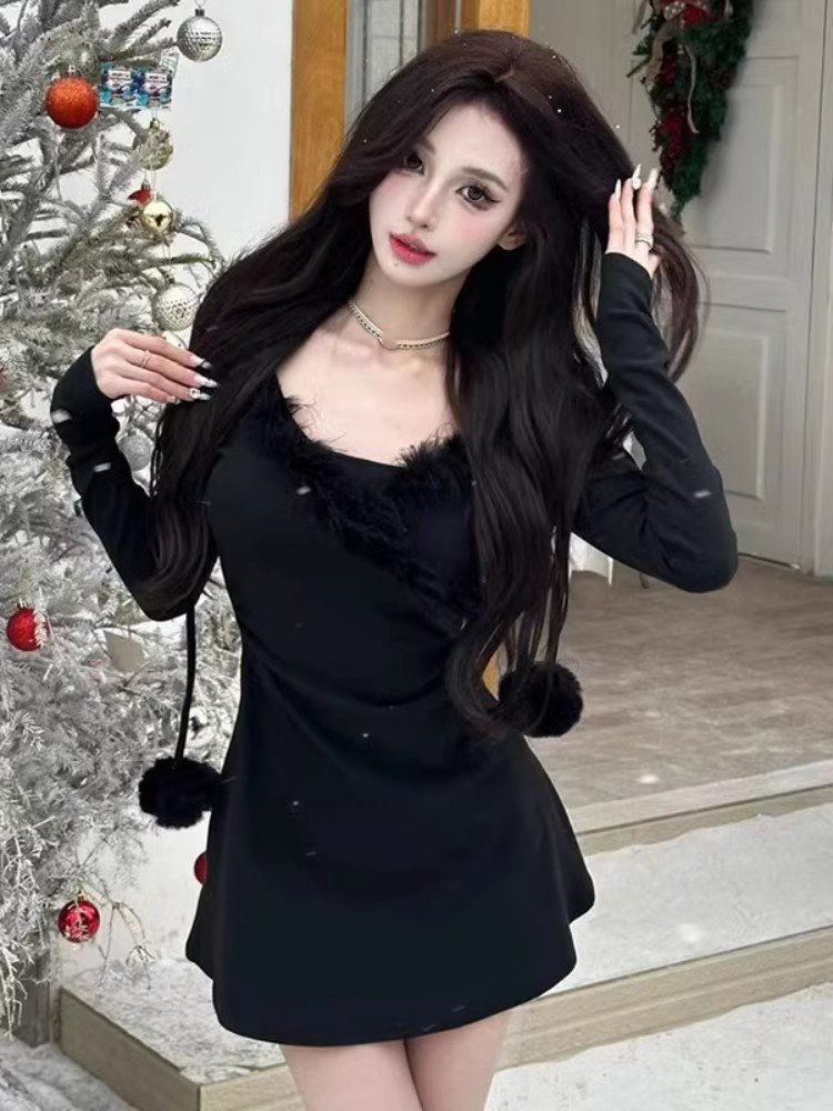 红色拼接毛毛连帽连衣裙女冬季跨年穿搭辣妹
