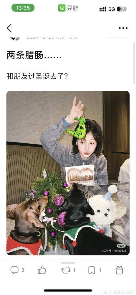 ④有网友说她19号还去做美甲(后续,说她做美甲的账号注销了),有网友扒拉说她好友过圣诞节,有赵养的狗出场(粉丝说只是寄养狗而已,并不是本人过圣诞)