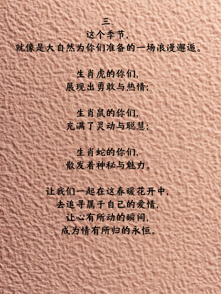 一、在 2025 年那春暖花开的时节,生肖虎、鼠、蛇的朋友们,仿佛迎来了命运的馈赠。这仿佛是上天特意为你们安排的恋爱季节,那温暖的阳光洒在身上,仿佛也预示着爱情的悄然降临。 二、你们内心开始有了微妙的悸动,仿佛有一股无形的力量在牵引着。也许是在那街头巷尾的一抹春色中,也许是在与朋友相聚的欢声笑语里,那心有所动的感觉愈发强烈,让你们开始期待着那份情有所归的美好。 三、这个季节,就像是大自然为你们准备的一场浪漫邂逅。生肖虎的你们,展现出勇敢与热情;生肖鼠的你们,充满了灵动与聪慧;生肖蛇的你们,散发着神秘与魅力。让我们一起在这春暖花开中,去追寻属于自己的爱情,让心有所动的瞬间,成为情有所归的永恒。