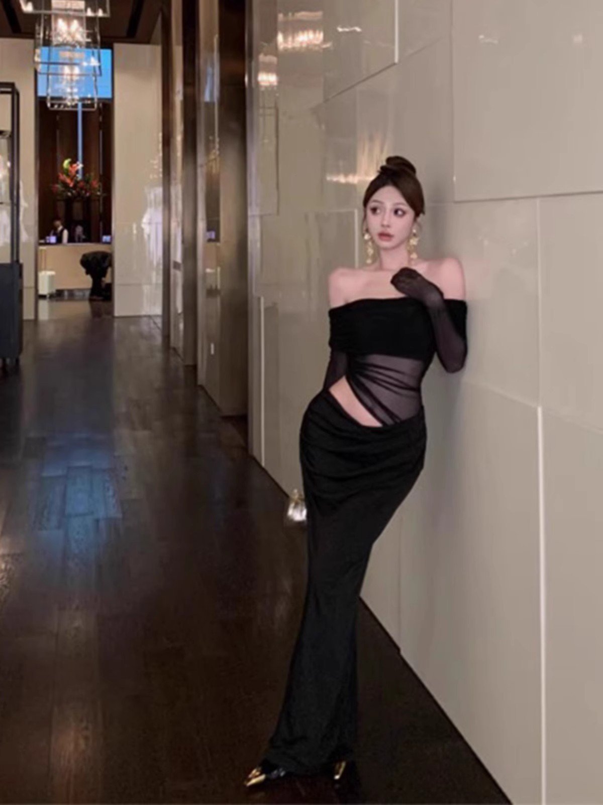 性感黑色一字肩网纱拼接连衣裙女冬季修身