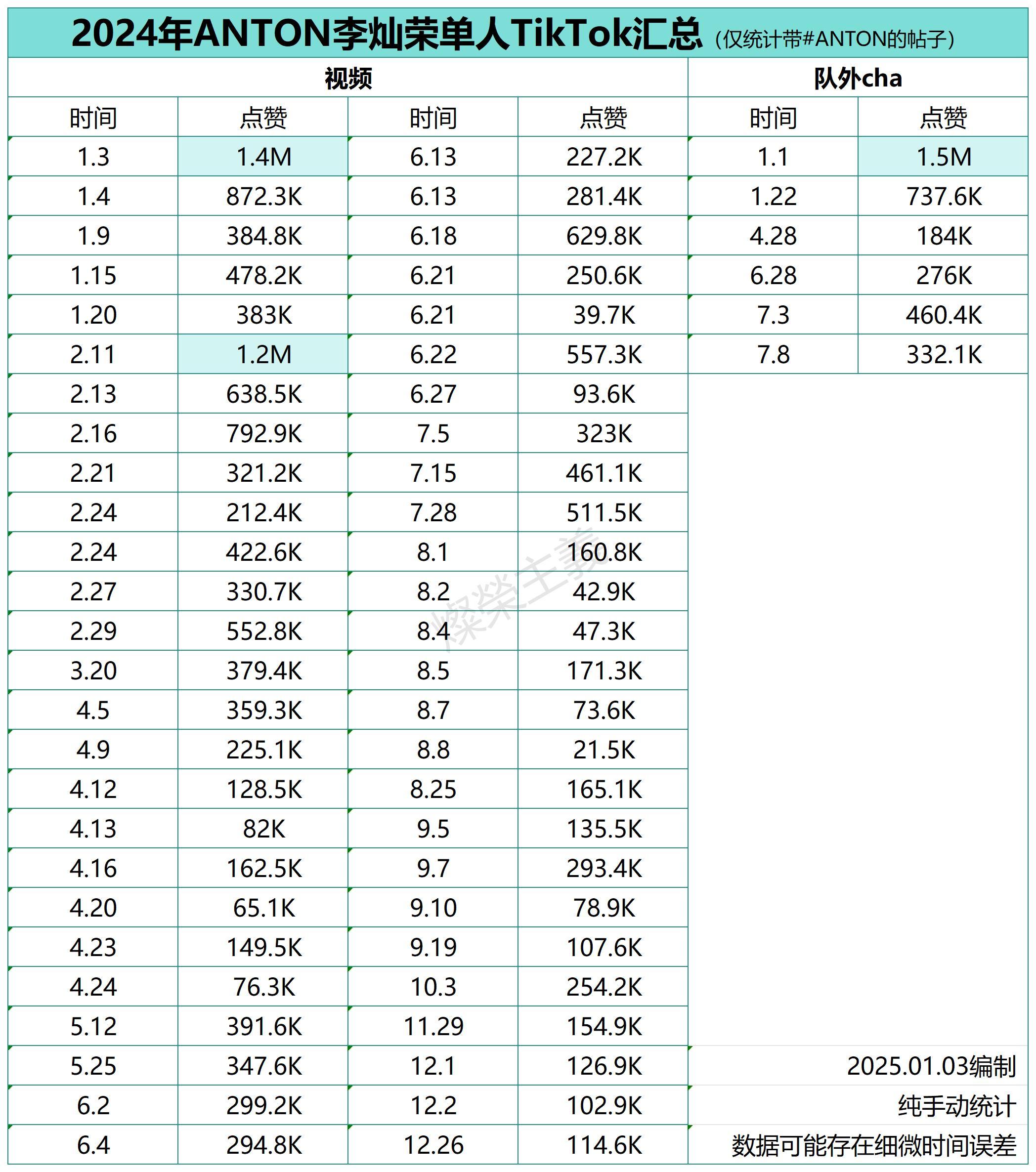 在2024年,灿荣一共发布了52条单人视频和6条队外单人cha,共计58条,其中3条达成百万点赞👍