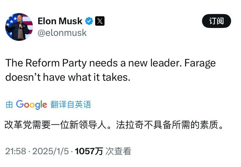 美国亿万富豪马斯克高调介入英国政治。 马斯克1月5日写道:“英国‘改革党’需要一位新领导人。现在的党首法拉奇不具备所需的素质。” 马斯克多次发文公开批评英国工党政府和首相斯塔默,新年伊始他呼吁英国人罢免斯塔默及其内阁部长,呼吁英国国王解散议会,重新举行选举。他强烈谴责英国政府拒绝对政府里的性侵团伙进行全面调查。马斯克支持排斥移民的右翼民粹主义政党“改革党”上台。 马斯克不仅在美国扮演政治要角,而且还对欧洲主要的资本主义大国英国和德国的内政进行批判和指点。他也呼吁德国总理朔尔茨提前下台,支持德国的右翼政党选项党上台。如此高调介入美国政治和欧洲大国内政,看来马斯克是想要拯救资本主义世界。