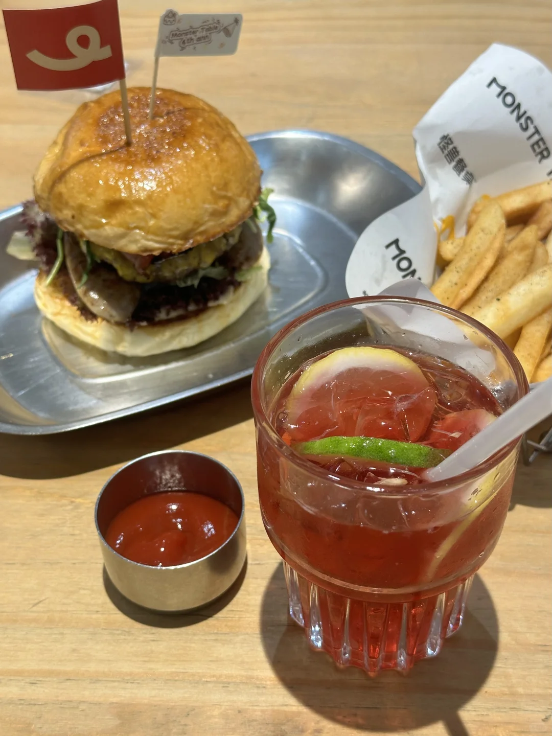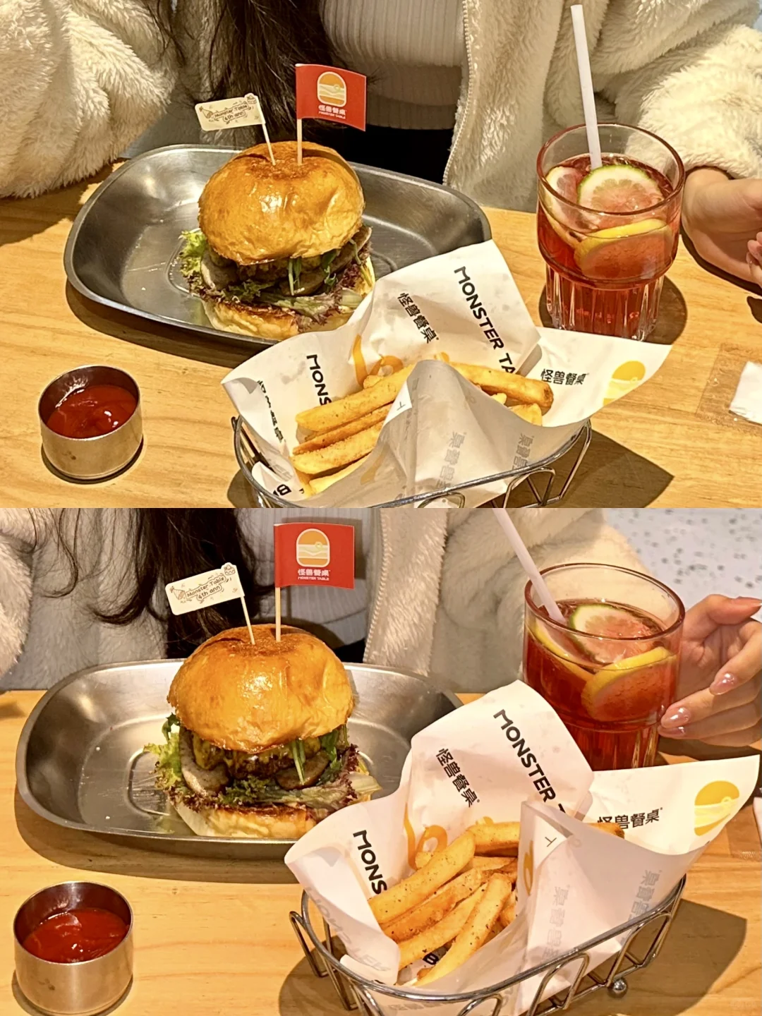 点了一个德国战车🍔 一听名字就是个热量炸弹哈哈 吃起来超级惊喜 满满的酱汁包裹着肉肠和可乐饼~料很足却不会腻 只想一口接一口的吃掉