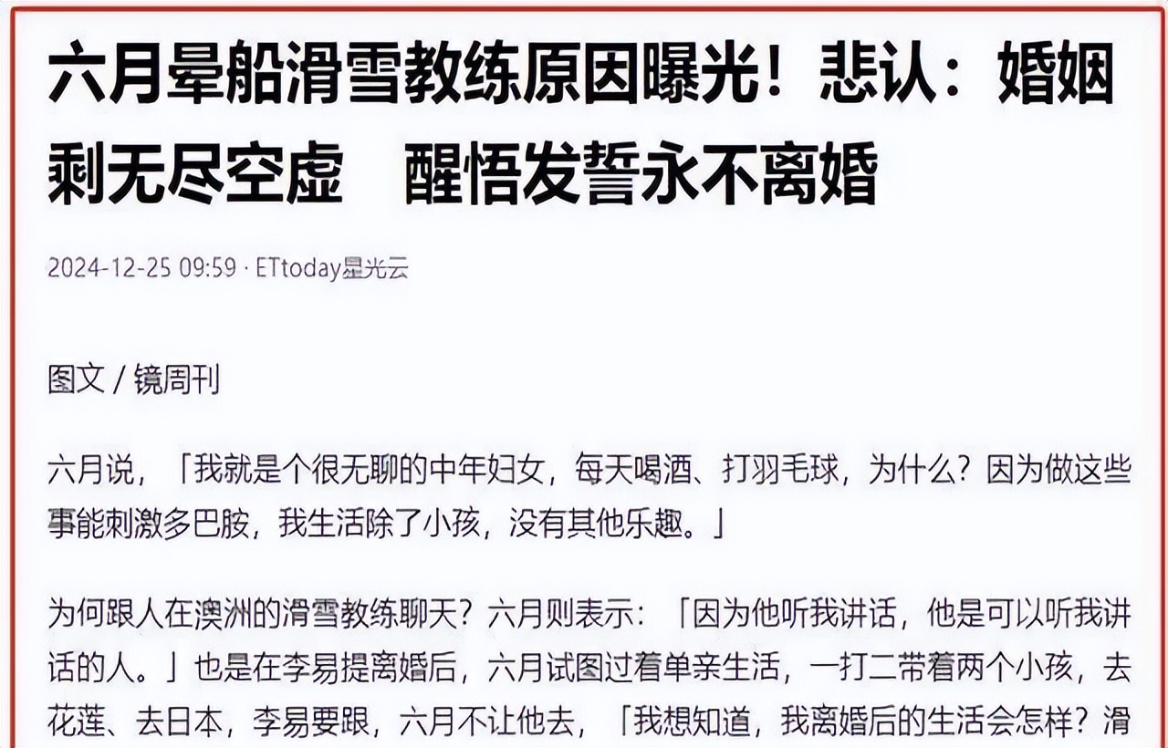 六月与李易的婚姻始于2011年,彼时两人的结合受到众多祝福。婚后,她为家庭生育了一子一女,逐渐淡出公众视野,专注于家庭生活。随着孩子的出生,夫妻关系却悄然走向了危机。生下二胎后,李易将卧室留给孩子,自己则独自居于书房,这种生活方式持续了八年,逐渐导致了两人之间的情感隔阂。在这段时间里,李易曾多次试图拉近与六月的距离,但都遭到了她的拒绝。家庭关系的破裂显而易见,直至2022年,李易正式提出了离婚申请。尽管如此,考虑到孩子仍小,两人决定暂时保持各自的生活状态,甚至不干扰彼此的交友自由,形成一种“模拟单身”的生活方式。这种安排显然对家庭的健康发展没有利好影响。女星六月被曝出轨小20岁滑雪教练,夫妻已分床8年,丈夫选择原谅 2025-01-05 14:46·运动达人秀w 台湾女星六月,因其清纯形象和出色的演艺事业,曾在娱乐圈中备受瞩目。如今,她却因与一名年轻滑雪教练的绯闻而引发广泛关注。根据媒体报道,六月与丈夫李易的婚姻早已名存实亡,夫妻俩已分房生活达八年之久。随着六月出轨事件的曝光,原本平静的离婚进程被迫提上日程。