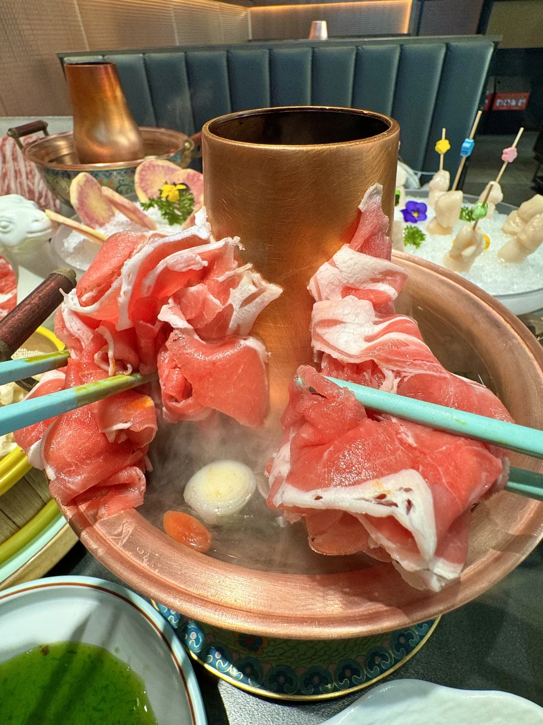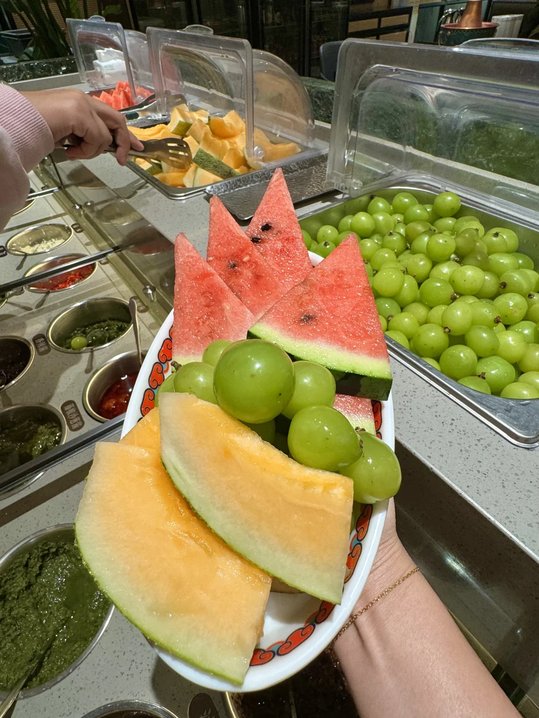 3刷了,水果自助,晴王葡萄、哈密瓜、西瓜…又甜又新鲜, 还有羊蝎子火锅,涮羊肉很舒服,据说肉是从内蒙古运过来的,烤羊肉串、纸皮羊肉烧麦、还有草原小羊布丁,很清爽微甜