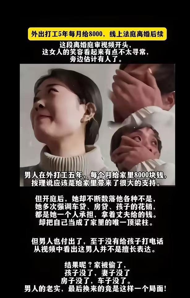 在庭审的最后二十秒,男方终于开口为自己辩解:“北京打工了五年,我钱全部交给你。”“每个月转给你八千,难道没有吗?”他的声音虽然微弱,但却充满了无奈和愤怒。这一句话,仿佛一把利剑,直接刺穿了燕东萍精心编织的谎言。新年新气象:2025年首杀冬萍笑离,5年倾尽全部,获得一个探视权 2025-01-08 10:12·大周、人生海海 2025年首杀,一个男人被虐的体无完肤。