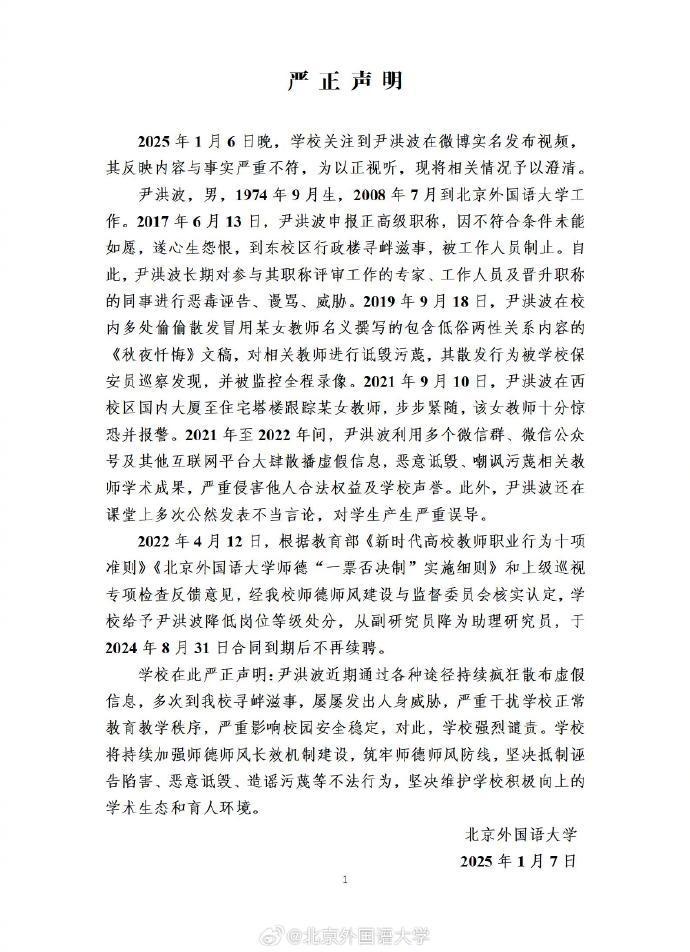 “2025年1月6日晚,学校关注到尹洪波在微博实名发布视频,其反映内容与事实严重不符,为以正视听,现将相关情况予以澄清。