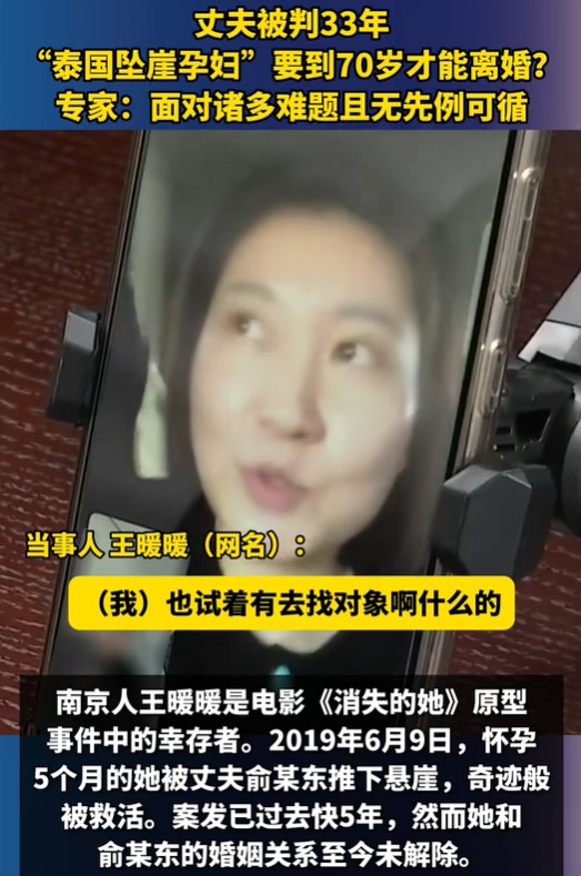 电影《消失的她》原型人物王暖暖,自从丈夫将她推下悬崖,她侥幸脱身回国之后,已经历经了5年,但是她和她的丈夫仍然没有离婚。 而具体离婚的原因也让人唏嘘。 根据观察者网2025年1月12日的消息! 原来她的丈夫被判了30多年的有期徒刑,这就意味着如果她丈夫不愿意出庭,那么对于他们两人的离婚审判案将无法进行。 王暖暖说:“我凭什么要跟这个男人做一辈子夫妻?” 如果二人无法离婚,那么就意味着需要等她丈夫服刑归来之后,二人才能离婚,那时的王暖暖早已经70多岁了。 70多岁,一个女人的一生都毁了。 最离谱的是,因为王暖暖没有离婚,以至于她身边有一些优秀的男士,看到她也不敢与她靠近。 所以这段时间,虽然她努力地去找男朋友,但是真正愿意跟她在一起的人却很少。 我们不知道事情的最后将是什么结局,不过从一些法律专业人士的角度来看,似乎他们的情况比较特殊,或许还有转机。 无论如何,都希望王暖暖女士能够最终通过合法的渠道离婚,然后摆脱曾经的阴影,找到属于自己的幸福。 人这一辈子,找到一个可靠的伴侣不容易。 所以,如果能有选择,请大家在寻找伴侣的时候,一定要仔细甄别对方到底是一个什么样的人。 如果找到一个“恶魔”,可能是我们一辈子的噩梦。 所以,慎重! #热点周际赛#