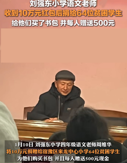 《刘强东回乡感恩,小学老师捐出10万元红包助力贫困学生》 今天的这个故事让人有些感动。 大家都知道,近日的刘强东回老家之后,向很多帮助过他的人,每人都发了10万块钱的红包。 而此事也很快冲上了热搜。 这些拿到红包的人中,就包括刘强东的很多老师。 根据《九派新闻》2024年1月12日的消息,这个故事的后续,让人有点感慨。 而刘强东的小学四年级语文老师周维华,做了一件让人不可思议的事情: 他将刘强东递给自己的10万块钱,全数捐赠给了来龙中心小学64位贫困学生,给他们买了书包,而且每人还赠送了500块钱的奖学金。 虽然刘强东之前,在美国发生的一些事情,让人对他的人品产生了怀疑,但不可否认的是,刘强东知恩图报的秉性,似乎并没有太大改变。 也许,他遇到的人,对他太好,以至于功成名就之后,也没有忘本。 当一个孩子,在遇到困难的时候,他触到的都是善意帮助,某些善良,便落在了心中。 这也许就是为什么?刘强东几乎每年都要回去感恩,那些帮助过自己的人。 因为这些人的帮助,他能才能上个好大学,才有今天的成就。 从某种角度说,他没有忘本,也跟他的老师们,密切相关,因为她们传授给他了最基础的道德理念和人格准则。 不过周老师,做出了如此大义的选择,不知道其他老师,会怎么做?