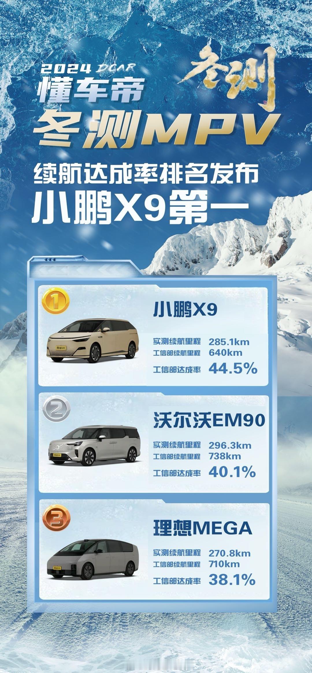 X9冬测数据喜人, 小鹏X9懂车帝冬季续航达成率测试MPV组第一