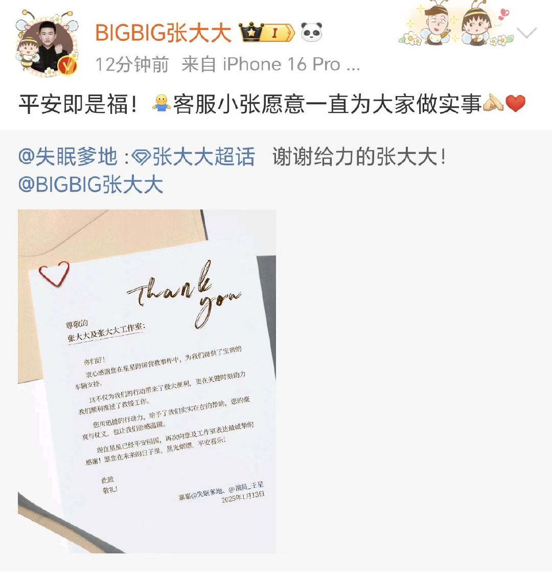张大大回复王星女友 王星女友发文谢谢给力的张大大 王星女友发文谢谢给力的张大大!张大大回复王星女友:“平安即是福![抱抱]客服小张愿意一直为大家做实事[作揖][心]”