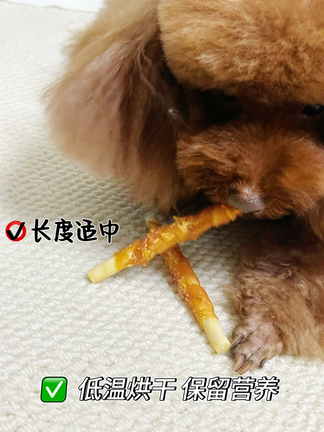 它严选高标准的牛皮,纯鸡肉缠绕,肉香满满,适口性很不错,奥利奥一分钟都等不了,直接上手😂